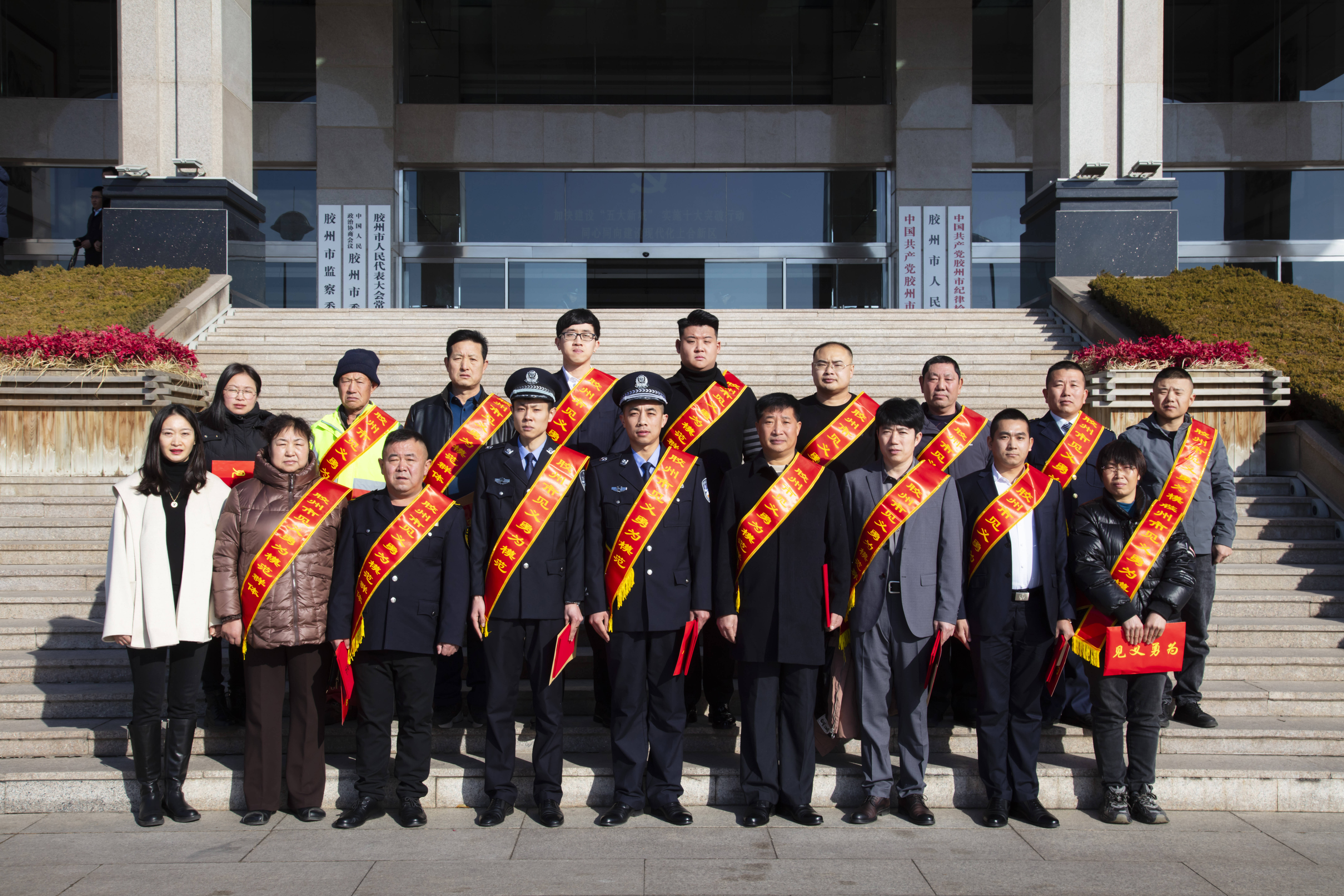 近日,胶州市委政法委和胶州市见义勇为协会举行了2023年度见义勇为模范个人(群体)的表彰活动,为孙一达、张道新、张楷浩等21名“胶州市见义勇为模范(群体)”颁发荣誉证书及奖励资金。