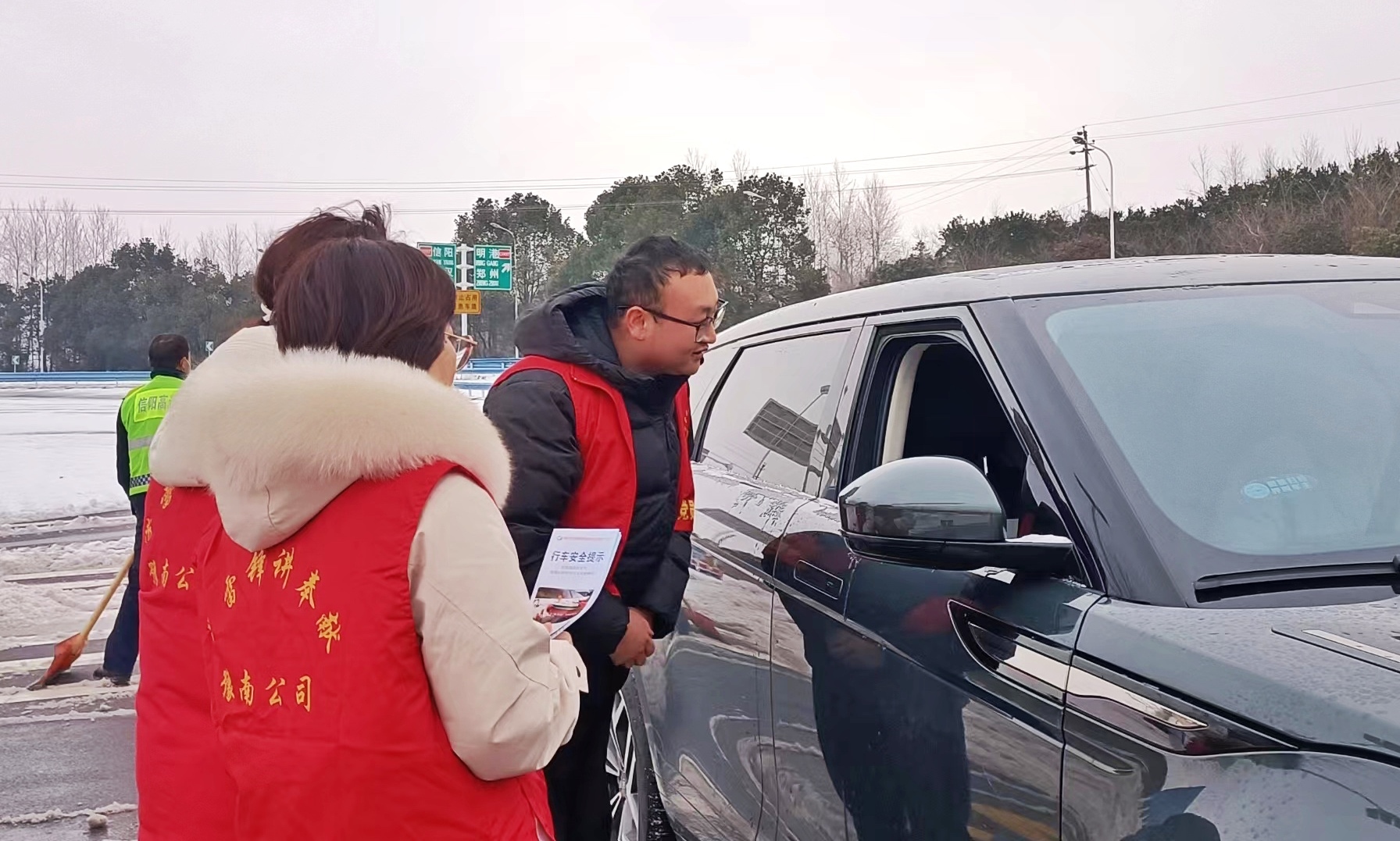 “师傅,您好!送您雨雪行车安全提示册,雨雪天气,请注意保持安全行车距离,祝您一路平安!”2月20日至21日,为进一步提高广大司乘雨雪天气行车安全意识,贯彻落实上级党委关于“以雪为令、党员先行、确保畅通”倡议书,河南交投建设集团有限公司豫南分公司党员们不仅在一线融雪融冰,在机关二线的党员也立足岗位实际,在完成业务工作之余为高速过往司乘发放“行车安全提示”小册子,用自己的实际行动,温暖着司乘人员的平安路。