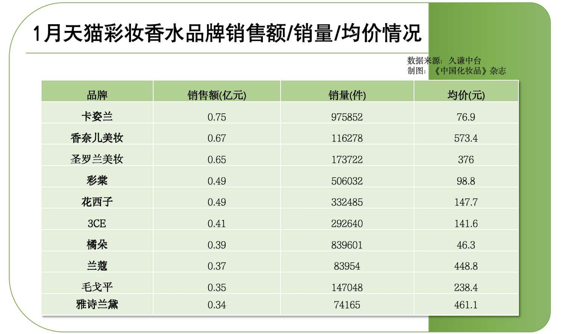 彩妆香水成为1月天猫美妆大类中唯一销售额增长的品类,销售总额为20.12亿元人民币,同比增加6.56%,环比增加3.71%。