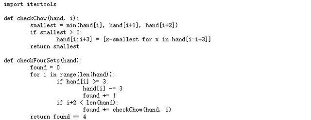 首先需要用数学语言定义每一种牌形。他们选择了一对数字(c, n),c表示花色,0为条、1为万,2为筒;n表示具体的数字。比如(0, 3)就是三条,(1, 5)就是五万。