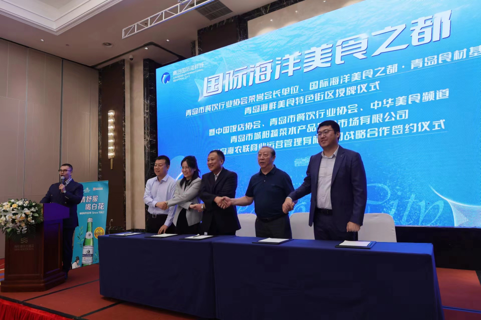 10月14日,“国际海洋美食之都·青岛食材基地”、“国际海洋美食之都·青岛海鲜美食特色街区”、“青岛市餐饮行业协会荣誉会长单位授牌”暨中国饭店协会战略合作签约仪式在城阳区圆满举行。青岛市商务局、青岛市税务局、青岛市工商联、青岛市民营经济发展局、青岛市广电中视有限公司、中国饭店协会、青岛市餐饮业协会、青岛市城阳蔬菜水产品批发市场等相关部门领导出席了此次签约授牌仪式。来自国内餐饮业优秀企业家、烹饪大师也齐聚现场,共同探讨海洋美食产业发展新风向。