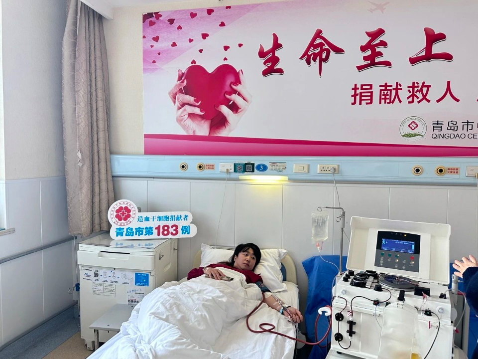 12月25日,造血干细胞采集室内,张世伟绷直手臂,静静地看着自己的血液通过透明的采血管导入机器,提取造血干细胞后再流回身体里。