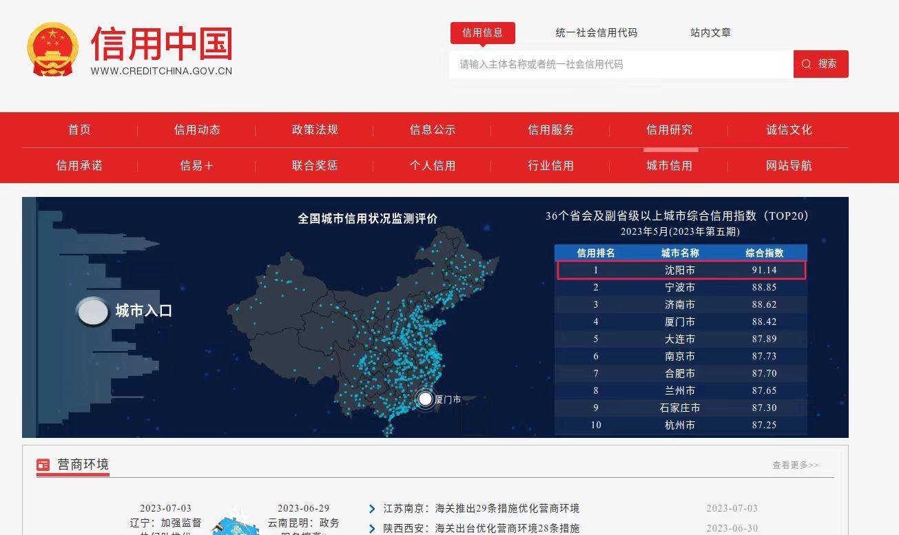 近日,“信用中国”网站发布了2023年5月(2023年第五期)全国省会及副省级以上城市综合信用指数排行榜,沈阳市以91.14的综合指数位列第一名!