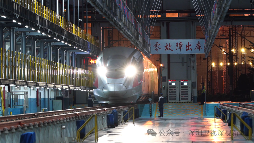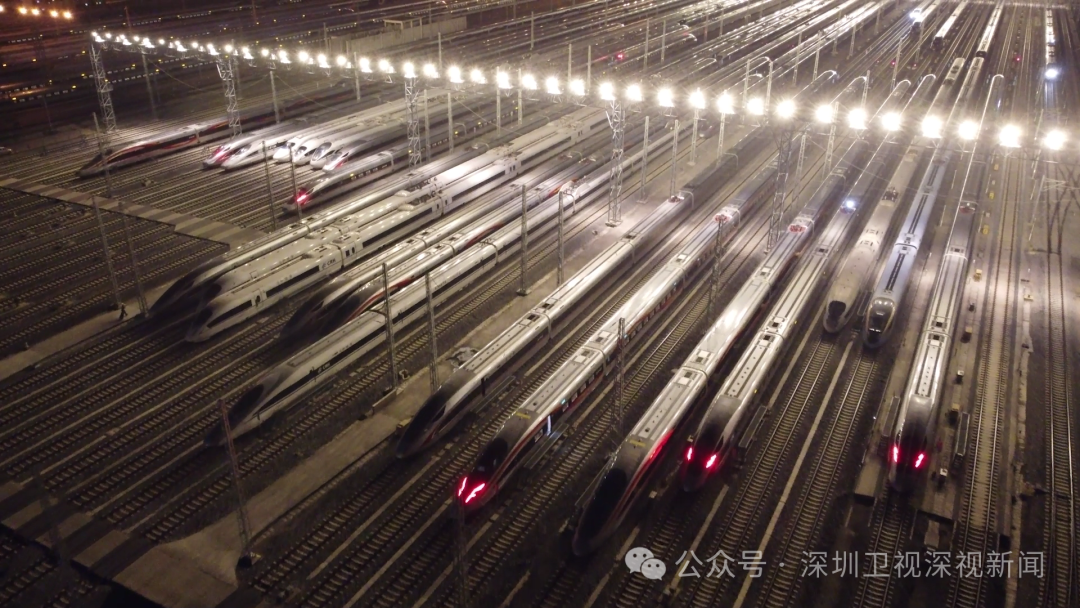 夜晚9点,距离深圳北站4.2公里外,动车正缓缓驶入粤港澳大湾区最大的动车“4S店”,深圳动车运用所。送完春运大潮下的人们回家后,动车在这里进行集体“保养”。