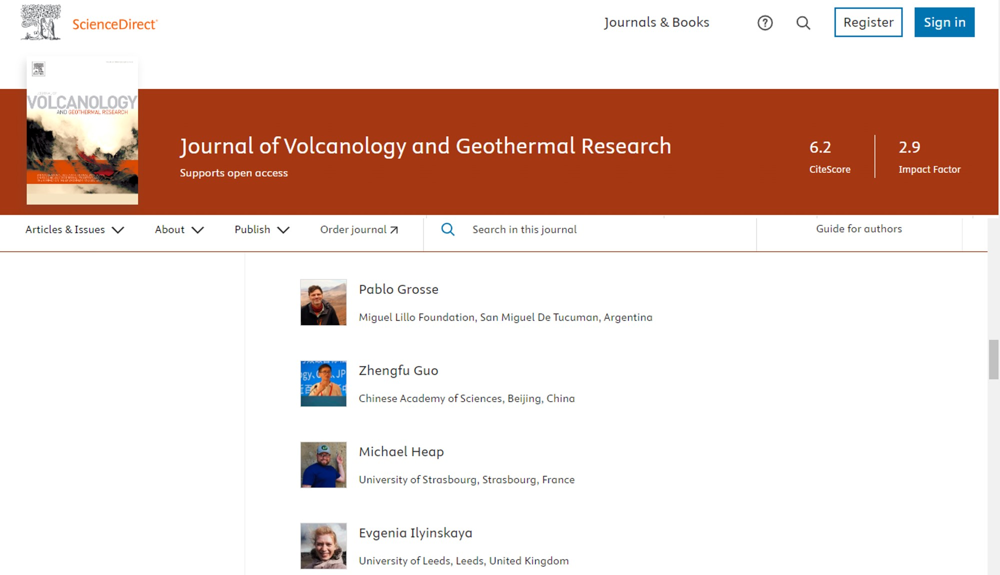 《Journal of Volcanology and Geothermal Research》创刊于1976年,由Elsevier出版发行。期刊研究范围涵盖火山地质学、火山岩岩石学与地球化学、火山地球物理学、火山监测与预测、火山灾害风险评估与防御、火山气体及其气候环境效应、火山岩浆与水热过程的计算和实验模拟以及岩浆和水热系统的水文和地球化学研究等多个领域,是火山学和地热学研究领域的国际权威学术期刊之一。该期刊编委主要来自意大利、德国、法国、新西兰、英国、日本、美国等国家,郭正府研究员是目前该期刊唯一来自中国的编委。
