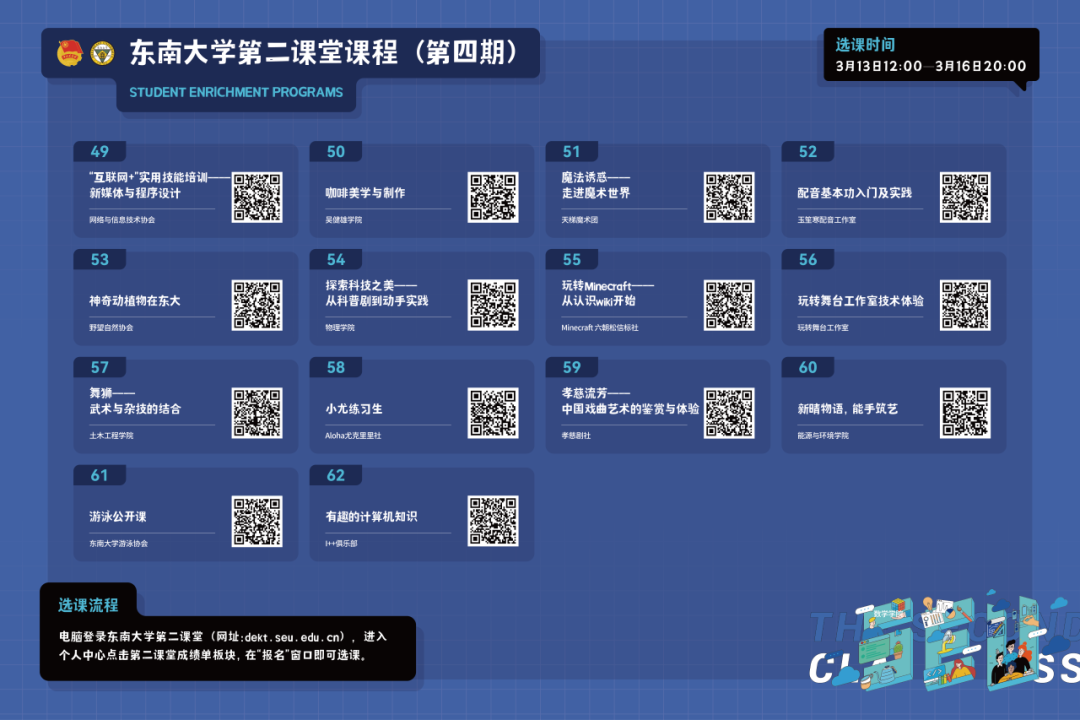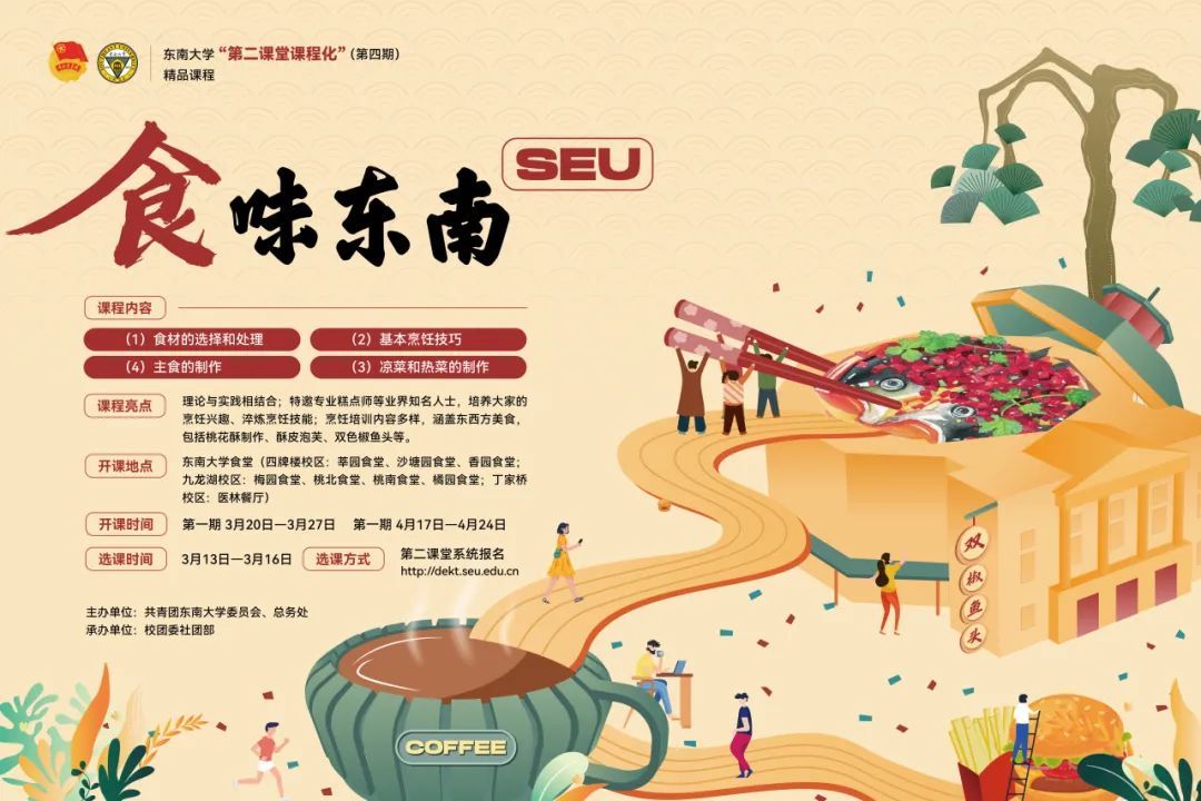 近期,校团委本学期将推出第二课堂课程化第四期课程,紧紧围绕五大精品课程主题:食味东南、美哉东南、草木东南、饮尚东南、健体东南,倾力打造系列匠心课程。