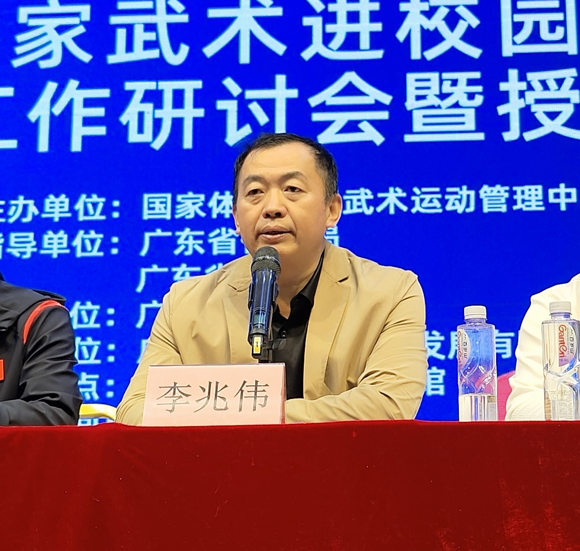 李兆伟介绍了广东省武术进校园的成果和推动武术项目进入奥运会的关键点。据介绍,目前广东省武术进校园的学校有587所,培训师资力量2162人,习练地方特色拳种咏春拳的在校学生约75万人。他表示,要深入贯彻落实国家武术进校园试点工作会议精神,充分发挥广东省作为国家南拳系列武术段位制先行先试省份的优势,全力打造以“政府主导、部门协调,协会管理,企业参与,全民动员、社会参与,以点带面、校园覆盖”为特点的武术推广普及品牌,推动武术文化事业和产业的繁荣发展,为讲好中国武术故事传递正能量。