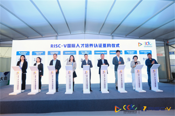 随后的签约仪式环节RISC-V国际人才培养认证中心主任蒋学刚与开源中国OSChina、北京算能科技有限公司、广东赛昉科技有限公司、厦门市开源芯片产业促进会、广东匠芯创科技有限公司、江苏润开鸿数字科技有限公司、硬蛋创新集团/科通集团、深圳矽速科技有限公司等8家行业龙头企业和机构代表签订合作协议,后续签约各方将共同参与RISC-V产业人才培养认证工作,在今后的人才招聘、就业机会中优先选择获得RISC-V国际人才培养认证的人才,相当于获得一张“就业直通车”入场券。