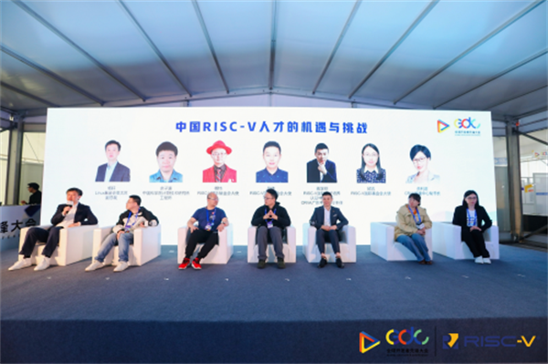 最后的圆桌环节由Linux基金会亚太区副总裁杨轩主持,RISC-V国际基金会大使吴伟、傅炜、邱吉,RISC-V国际人才培养认证中心主任&CRVA广东中心执行主任蒋学刚,中国科学院计算技术研究所工程师余子濠,CRVA福建中心秘书长贠利君,共同就“中国RISC-V人才的机遇与挑战”展开交流与讨论。