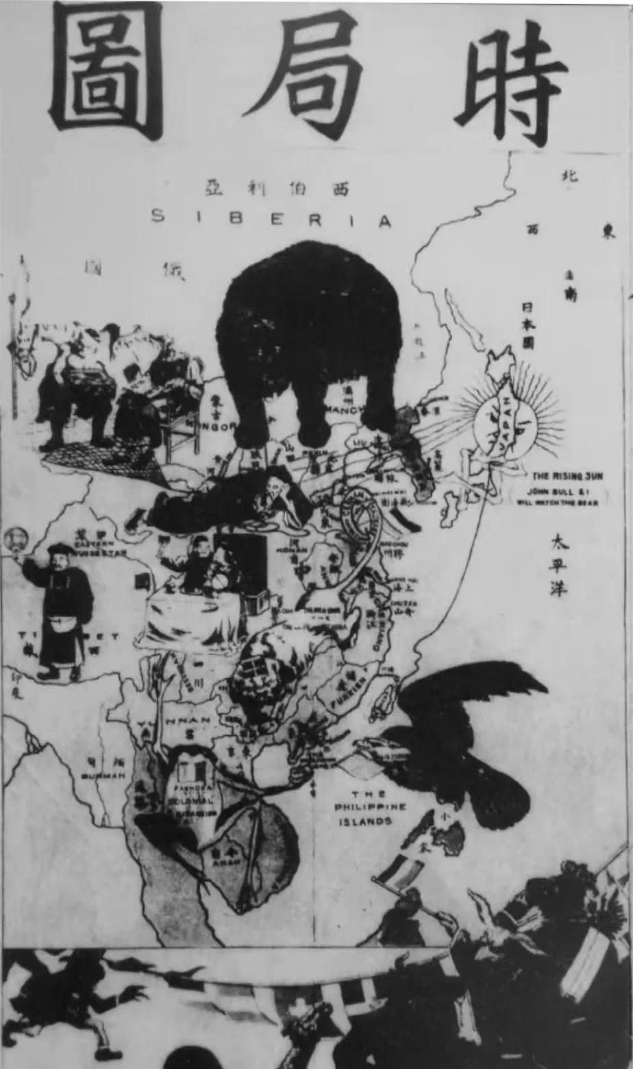 《时局图》正创作于谢缵泰为革命奔走呼号的时期。谢缵泰感慨时事,不忍见神州陆沉,希望通过漫画唤醒沉睡的国人。《时局图》形象地描绘出各国瓜分中国的意图。其意义昭然若揭——图中的熊、犬、蛙、鹰、蛇、太阳都盘踞在中国版图之上,而清政府只能任其宰割。