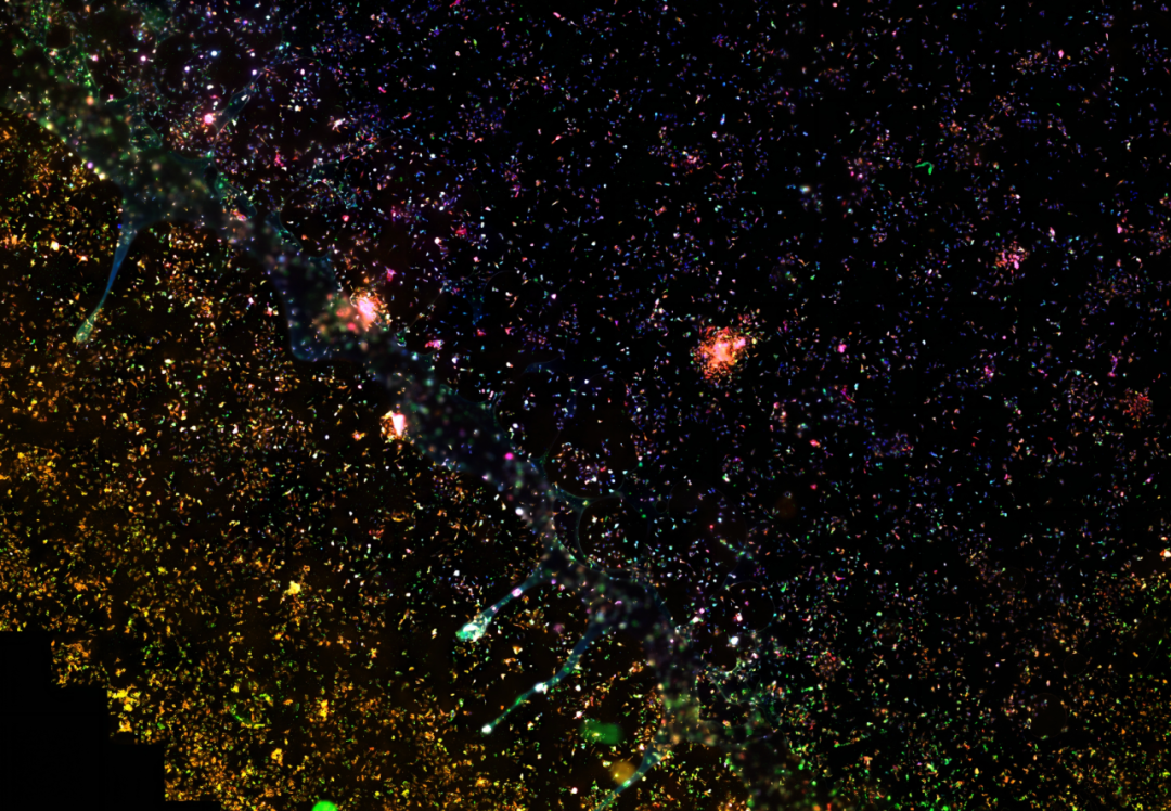FITC、DID和DIL三种荧光渲染三种细胞碰撞出的画面如璀璨星空,就像无数的星球“织出”五彩斑斓的璀璨,大大小小的细点在向我们呈现小小细胞中的无穷宇宙。