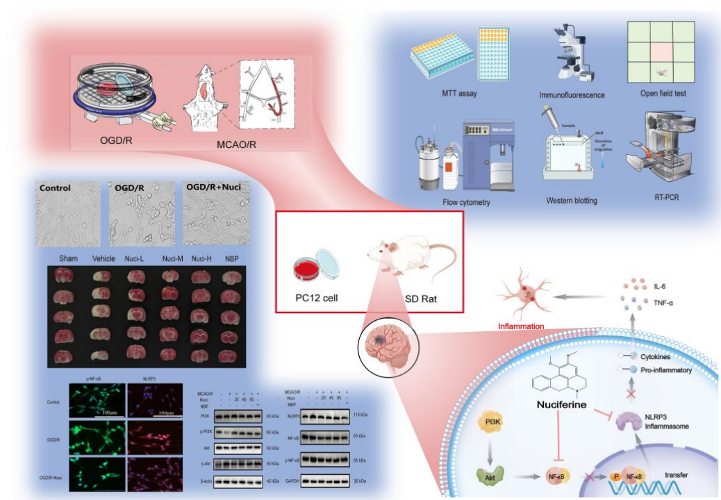 本作品为荷叶碱通过 PI3K/Akt/NF-κB途径减轻脑缺血再灌注损伤诱导炎症研究的图文摘要(Graphical Abstract)。本研究以荷叶碱为研究对象,通过构建PC12细胞OGD/R模型和SD大鼠MCAO/R模型,采用多种细胞和分子生物学实验方法评价荷叶碱减轻脑缺血再灌注损伤诱导的炎症的作用效果和探究其分子机制,为荷叶碱的药物开发和临床防治脑缺血再灌注损伤提供了新的思路。