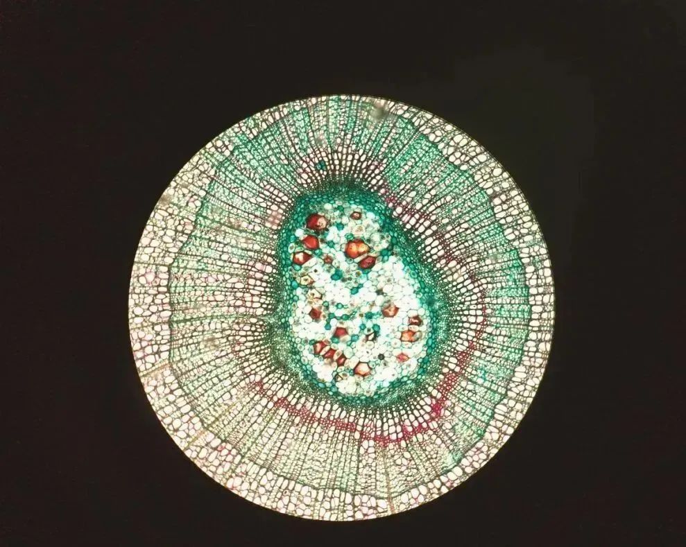 本作品为显微镜下放大100倍后的椴树木质茎的横切面切片,画面中密集的年轮仿佛在诉说椴树经历过的风雨故事,每一道纹理都是岁月的印记,让人不由得陶醉其中,感受到生命在微观世界中的奇妙和无穷魅力。