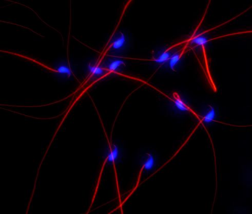 本图为小鼠精子细胞荧光染色图,蓝色是精子头部,红色是精子尾部。蓝色和红色,彼此交织在一起构成完整形态的精子细胞,形成了生命之初的绚丽景象。