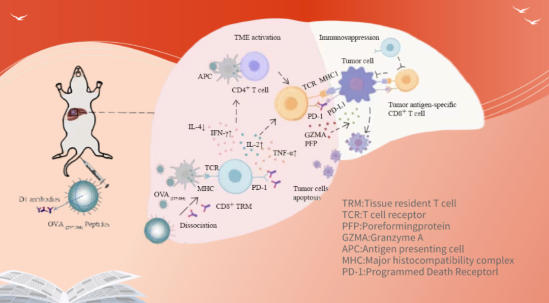 活化CD8+TRM分泌INF-γ和TNF-α,可与免疫微环境中DCs、B细胞等免疫细胞交叉“对话”,激活已耗竭肿瘤抗原特异性CD8+T细胞的活化增殖,对于提高PD-1治疗响应率具有重要意义。肿瘤患者体内CD8+TRM数量及活性与其生存率正相关,但在抗PD-L1或PD1治疗的HBV+HCC患者体内,CD8+TRM抗肿瘤功能高度耗竭。因此,持续有效活化CD8+TRM细胞应答的疫苗策略具有重要现实意义。