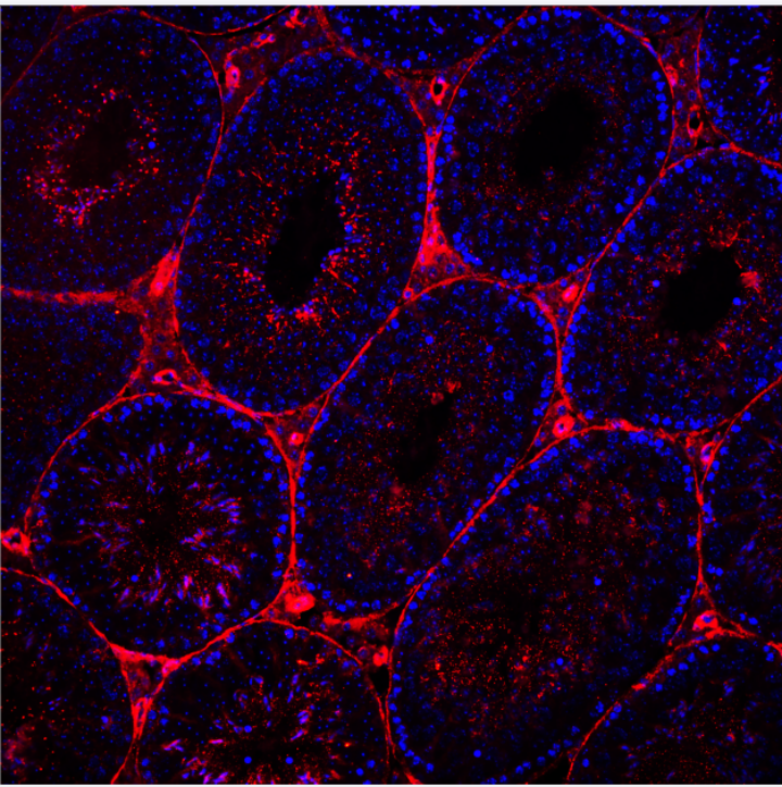 小鼠睾丸切片的免疫荧光染色,相应蛋白染料和DAPI染色后的merge图像,图中一个个的圆形小管为小鼠睾丸内生精小管。从微观到宏观,从简单到复杂,科学的探索永无止境,共同谱写生命的壮丽诗篇。