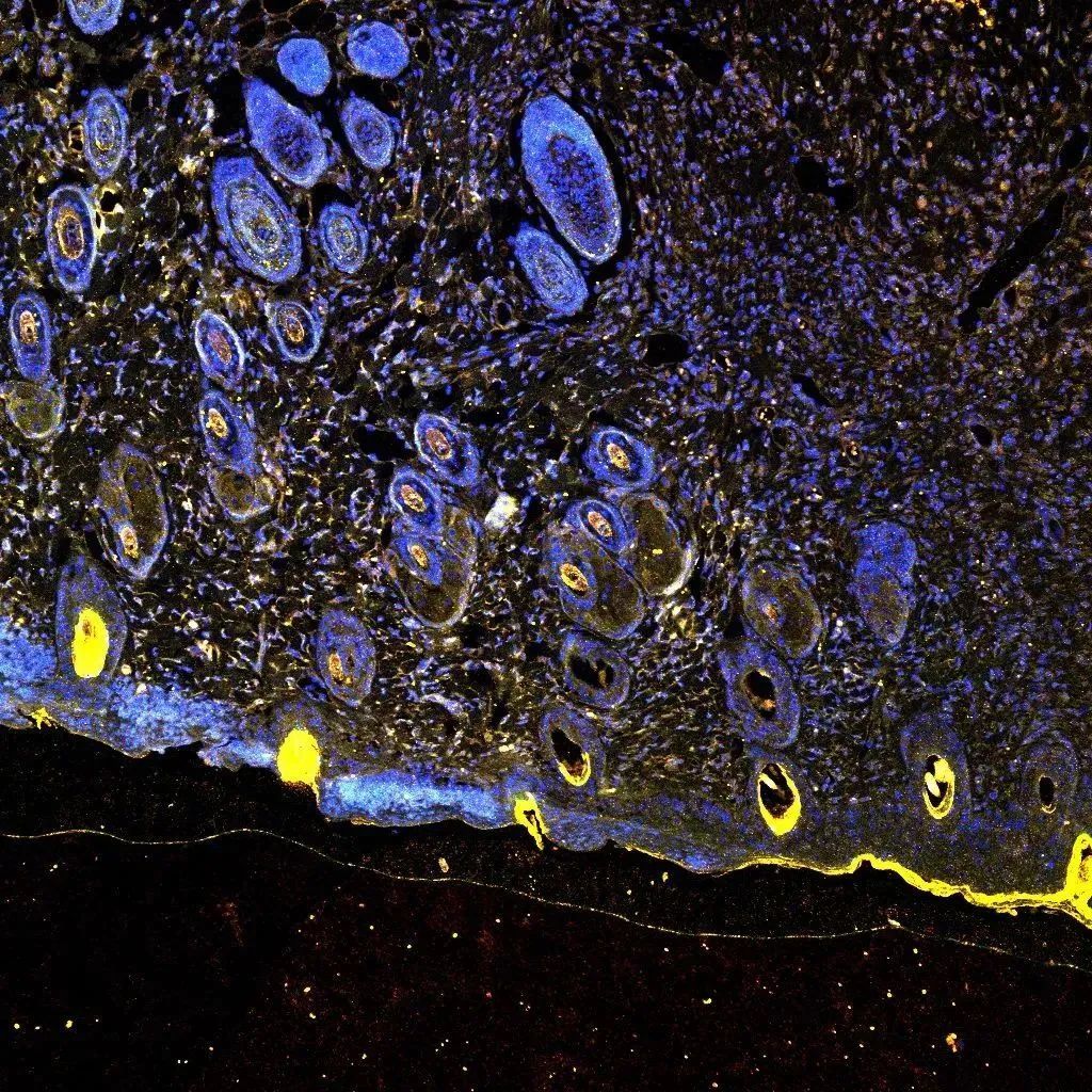本图为小鼠皮肤的免疫荧光染色,表现的是毛囊在皮肤上的排布。画面内容像梵高笔下动态变化的星空,明暗相间的色彩,诠释着科研探索的魅力所在。
