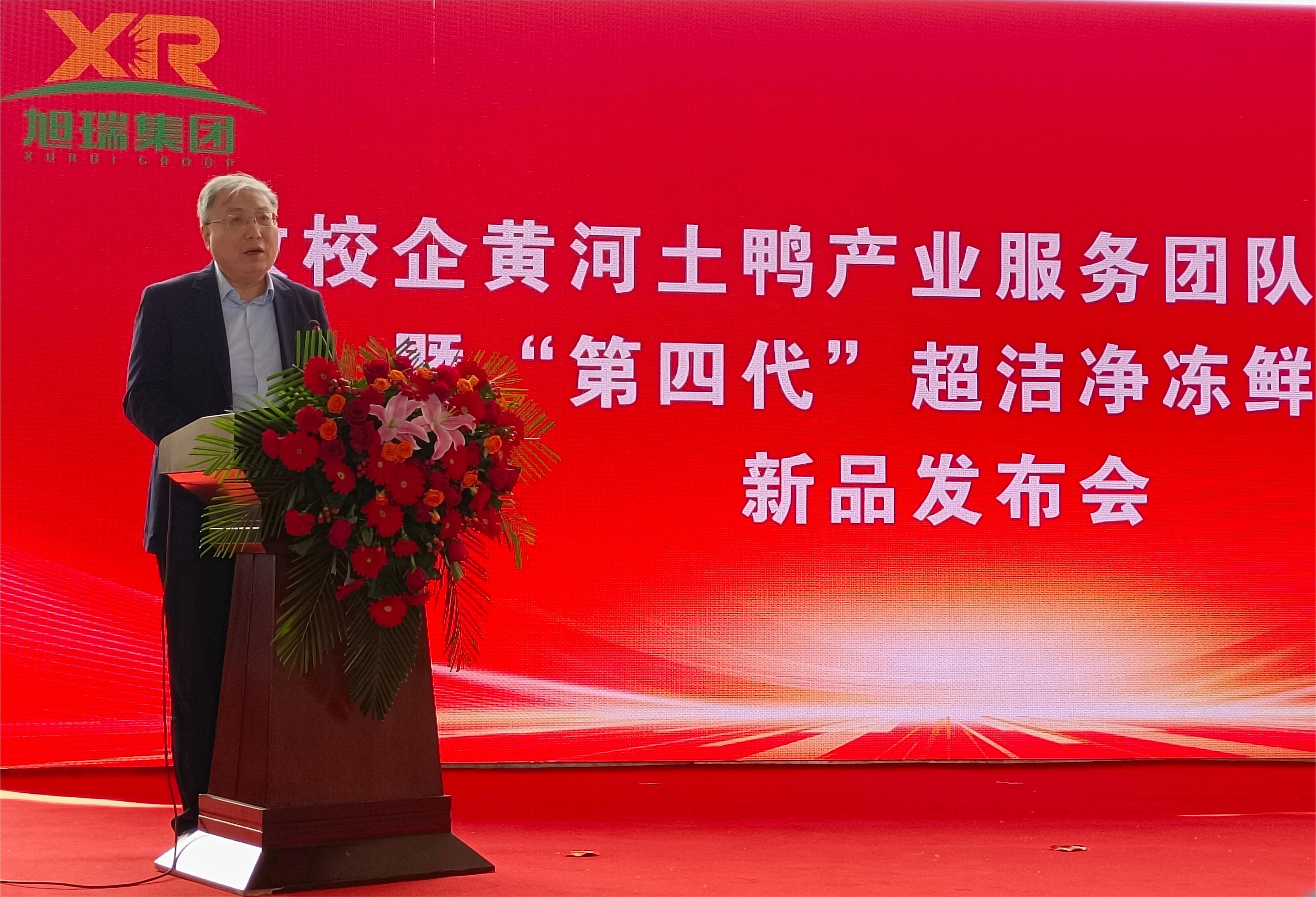 穆瑞杰在致辞中指出,“新质生产力”的提出,为我们在新发展阶段打造经济发展新引擎、增强发展新动能和构筑国家新优势提供了重要指引。黄河土鸭产业服务团队的共建是校政企同向发力的结果,“第四代”超洁净冻鲜鸭血新品的发布是多方同题共答的结果,是政策、产业、科技、人才等各方资源优势充分共享的结果。希望校政企继续深入实施 “双百”工程,创新政产学研合作机制,优化“政府+产业服务团队+龙头企业”服务合作模式,推动新质生产力快速形成,助力河南旭瑞食品有限公司提质增效以及黄河土鸭产业高质量发展,为武陟乡村振兴提供更好的人才与科技支撑。