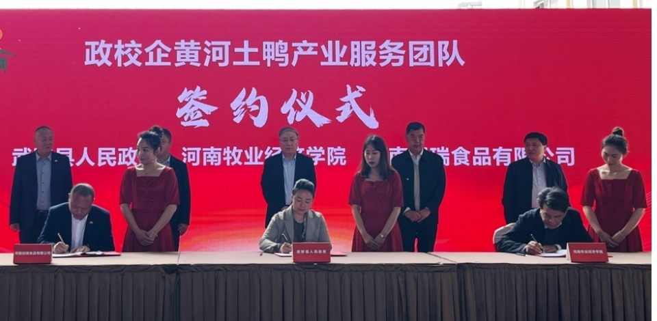 4月8日上午,河南牧业经济学院与武陟县人民政府、河南旭瑞食品有限公司共建“黄河土鸭”产业服务团队签约仪式暨“第四代”冻鲜鸭血新品发布会在武陟县举行。