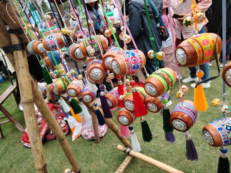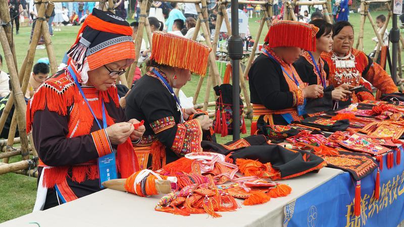 众多非遗工艺品惊艳亮相,其中包括合浦角雕、北流沉香线香、北海贝雕、广东香云纱、云南乌铜走银等。同时,一系列非遗项目也吸引了大量游客参与体验,大家纷纷动手尝试扎染、刺绣、香囊制作、壮族织锦、油纸伞编制等传统手工艺,深入感受非遗文化的魅力。