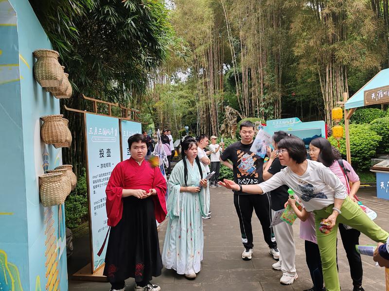 同时,“三月三”国风市集也为游客们带来了别样乐趣。蹴鞠和投壶等小游戏吸引了大批游客参与打卡挑战,大家在欢声笑语中体验传统文化的魅力。在科技潮玩街区,科技与普法相结合的互动装置,让游客们在娱乐中感受普法成果。