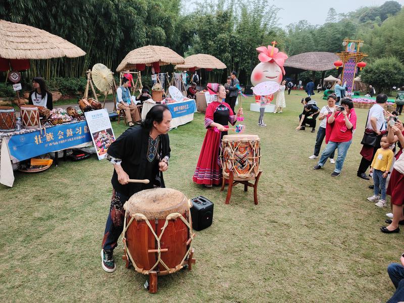 全天呈现了一系列具有民族文化特色的节目表演,让游客们沉浸其中。此外,多种非遗项目和特色美食也让游客们流连忘返。游客们可通过参观打卡的方式,全方位、多角度体验民俗文化魅力。现场不少游客穿着传统服饰,更有游客自发唱起山歌,让更多人了解广西的山歌文化。