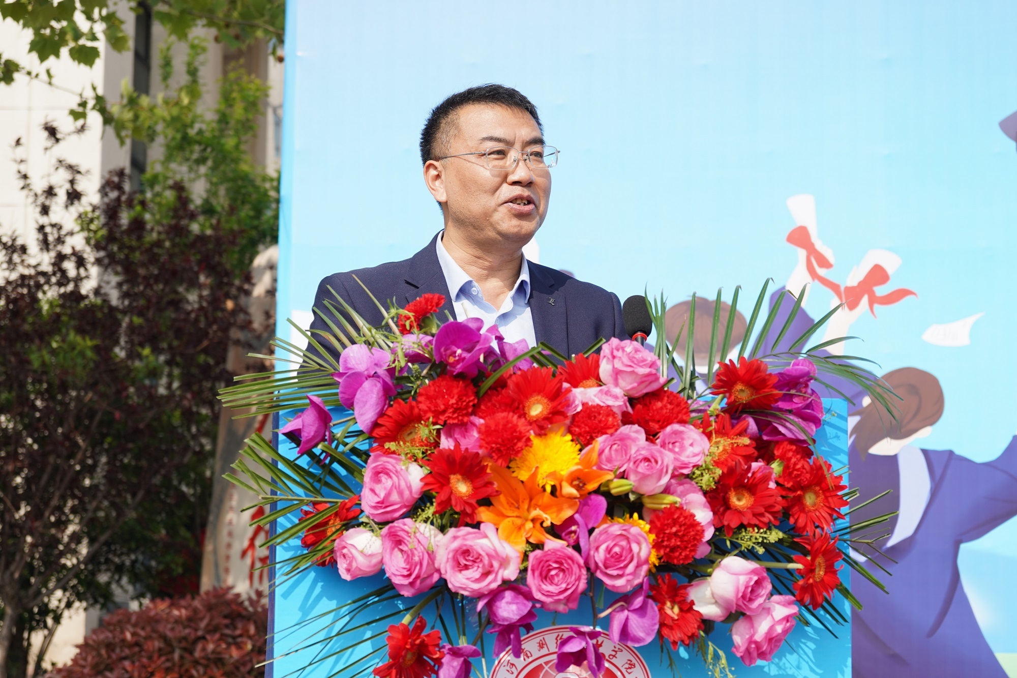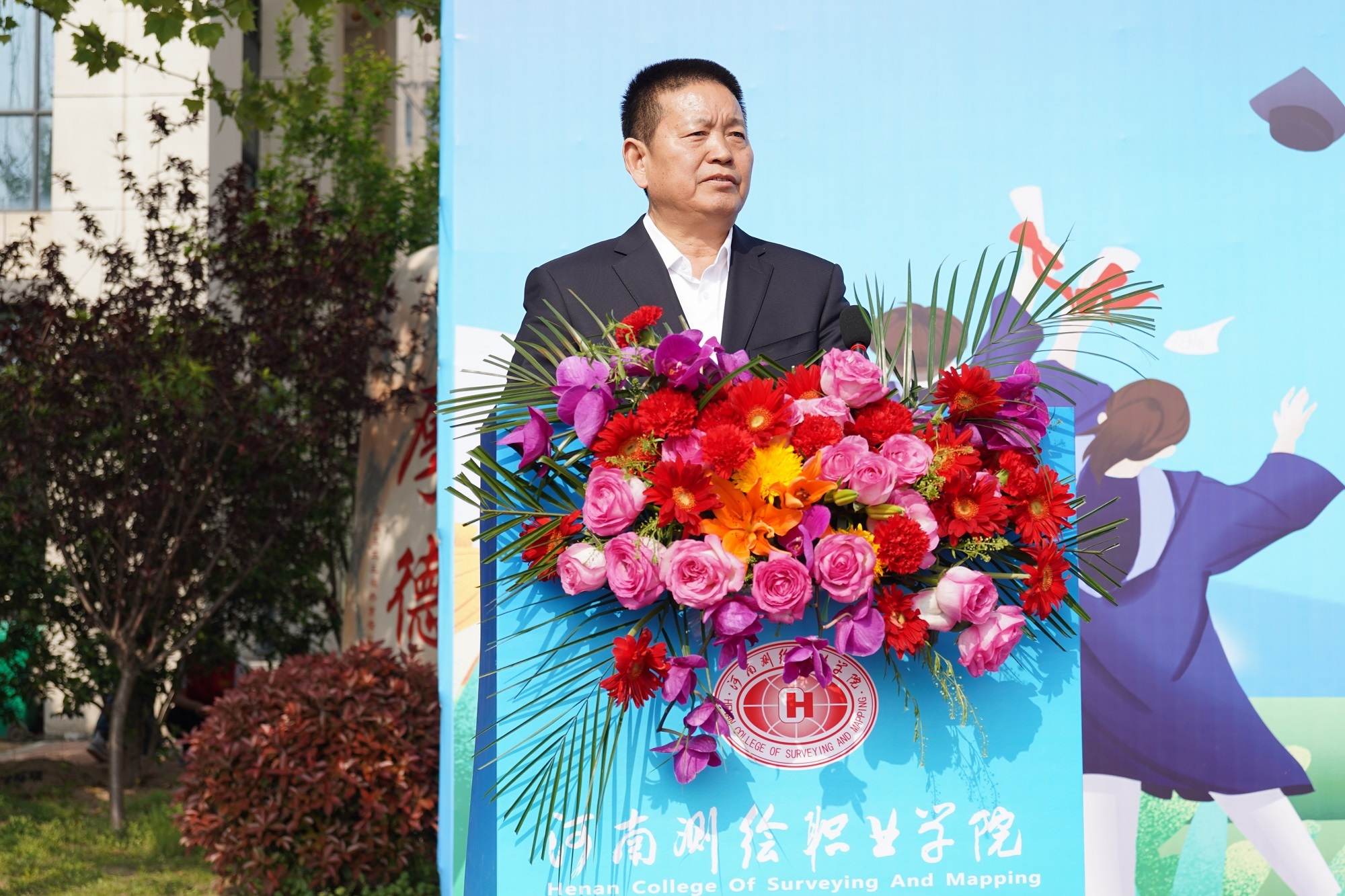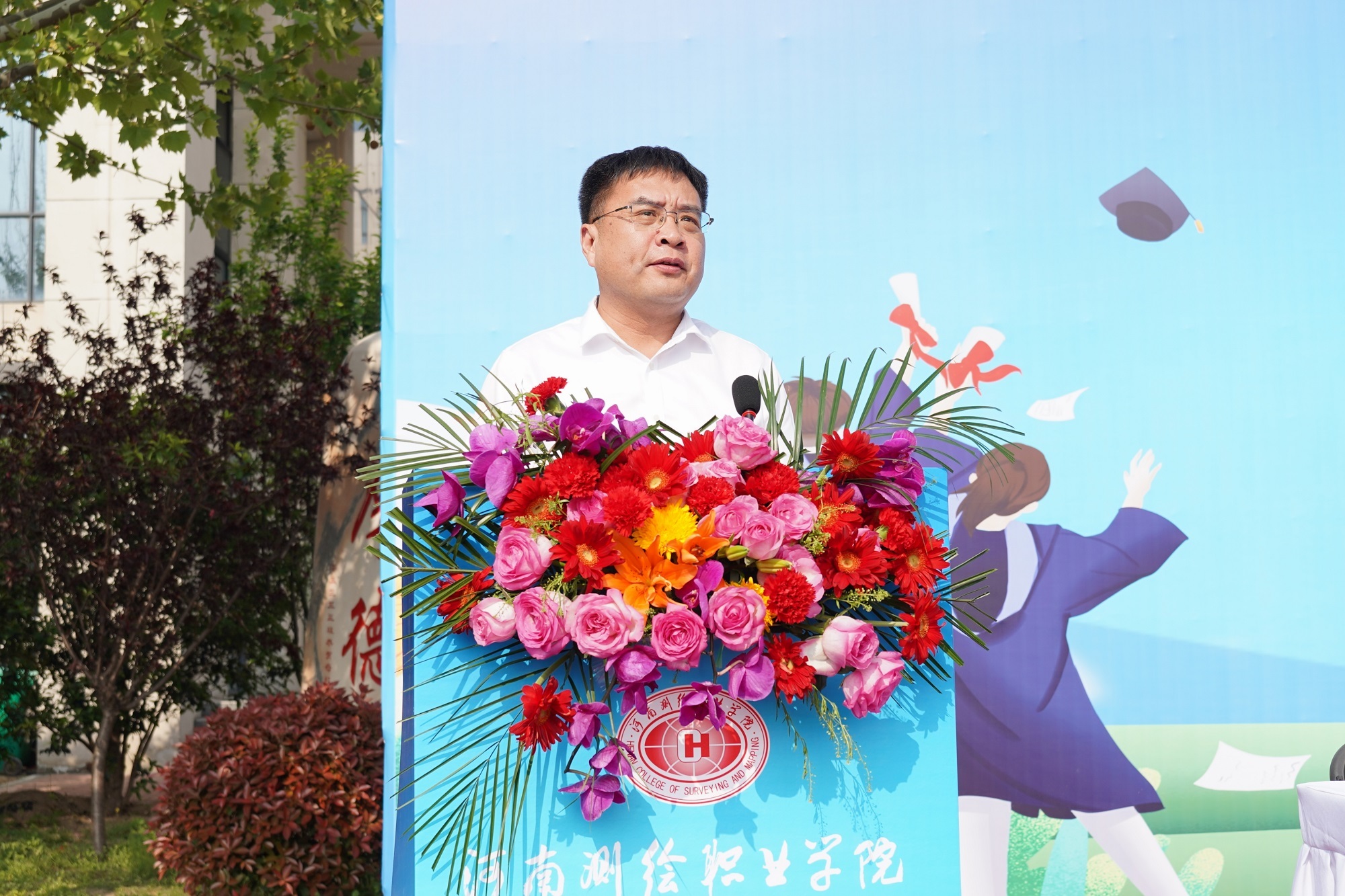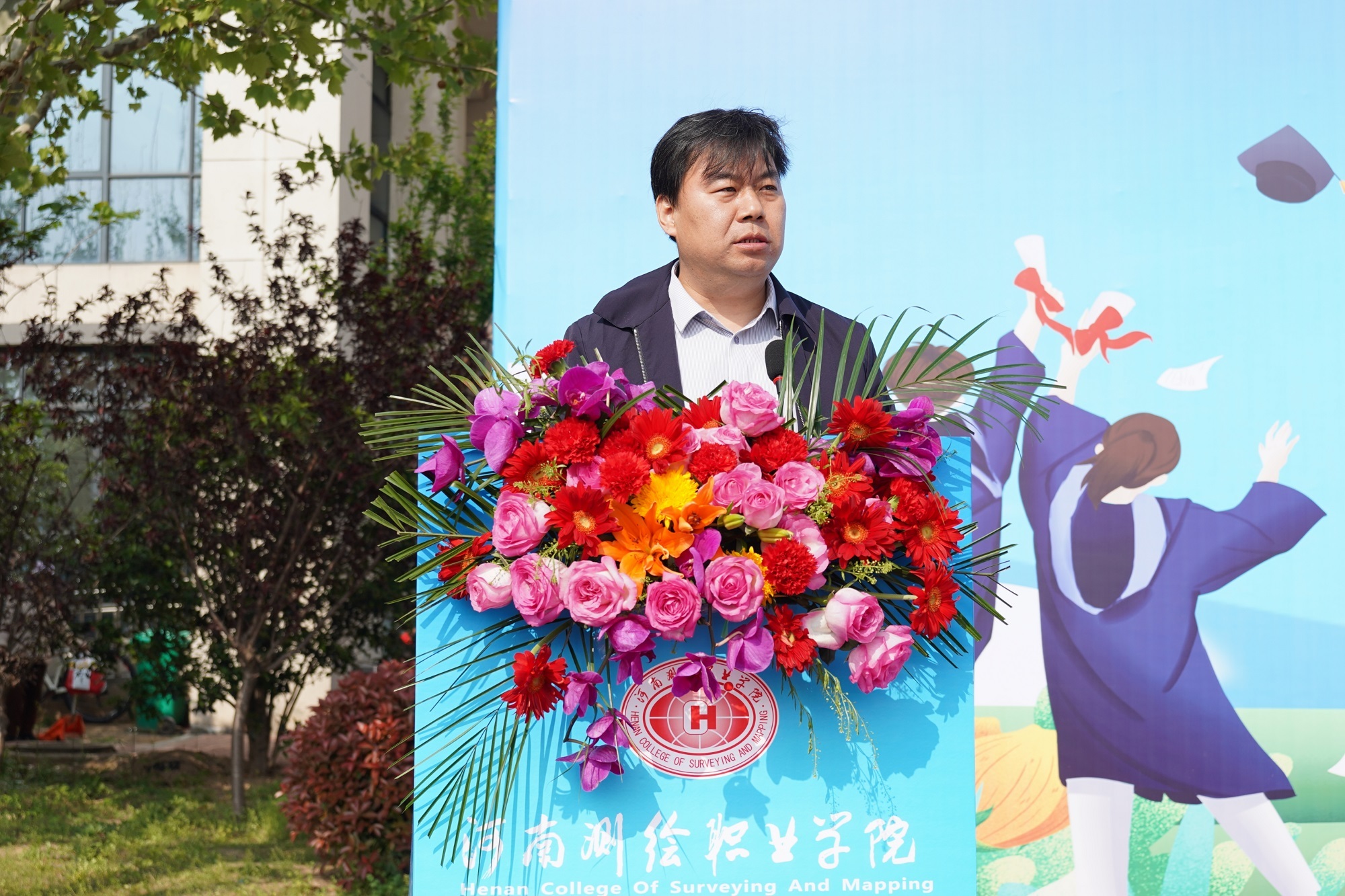 学校1997级毕业生、河南省地理信息产业协会副会长兼秘书长、河南省地图院副院长曹源作为校友代表发言,他感谢了母校的培养,对老师们悉心教导和辛勤培育表示衷心的感谢,对即将走向工作岗位的师弟师妹们送上了祝福。
