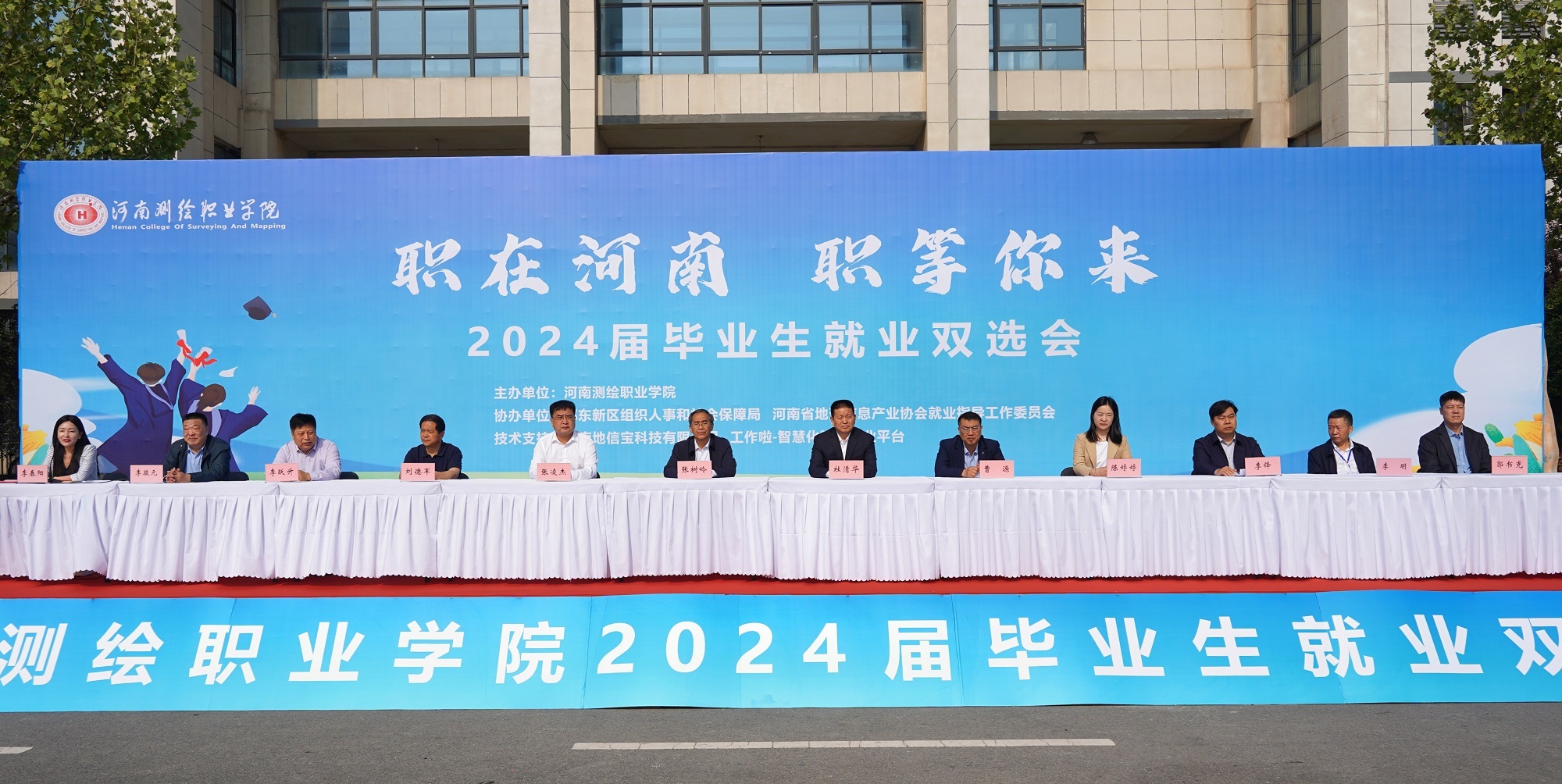 4月13日上午,河南测绘职业学院2024届毕业生就业双选会开幕式举行。原河南省自然资源厅副厅长、一级巡视员杜清华,河南测绘职业学院党委书记张树岭、校长张凌杰出席开幕式。党委副书记李骏元、副校长李明、副校长李春阳、纪委书记郭书克、河南省地理信息产业协会和河北省地理信息集团有限公司代表参加开幕式。开幕式由李春阳主持。