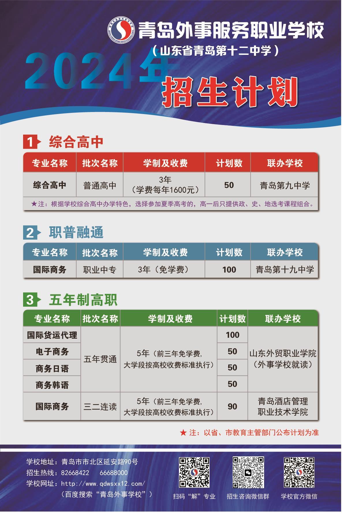 据介绍,目前学校与青岛九中合作开展综合高中办学,与青岛十九中合作职普融通实验班,职普教育优势融合互通,为学生开辟夏季高考、职教高考、出国留学、职场就业四条发展路径,满足学子、家长对优质教育的需求。