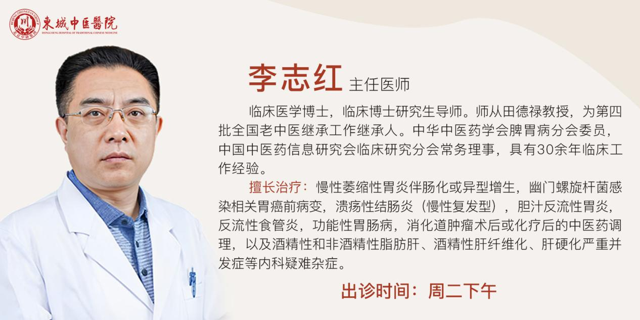 李志红,东城中医医院特聘专家,出诊时间周二下午。主任医师,临床医学博士,临床博士研究生导师。师从田德禄教授,为第四批全国老中医继承工作继承人。中华中医药学会脾胃病分会委员,中国中医药信息研究会临床研究分会常务理事,具有30余年临床工作经验。擅长治疗:慢性萎缩性胃炎伴肠化或异型增生,幽门螺旋杆菌感染相关胃癌前病变,溃疡性结肠炎(慢性复发型),胆汁反流性胃炎,反流性食管炎,功能性胃肠病,消化道肿瘤术后或化疗后的中医药调理,以及酒精性和非酒精性脂肪肝、酒精性肝纤维化、肝硬化严重并发症等内科疑难杂症。