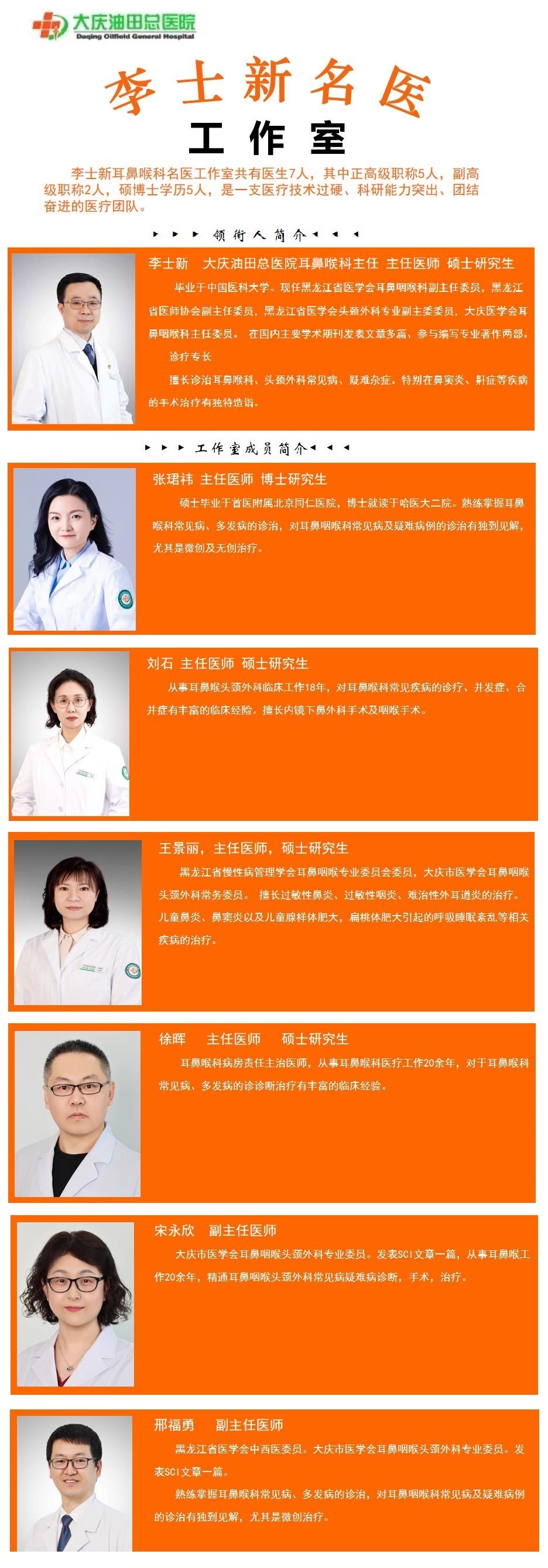 李士新耳鼻喉科名医工作室共有医生7人,其中正高级职称5人,副高级职称2人,硕博士学历5人,是一支医疗技术过硬、科研能力突出、团结奋进的医疗团队。