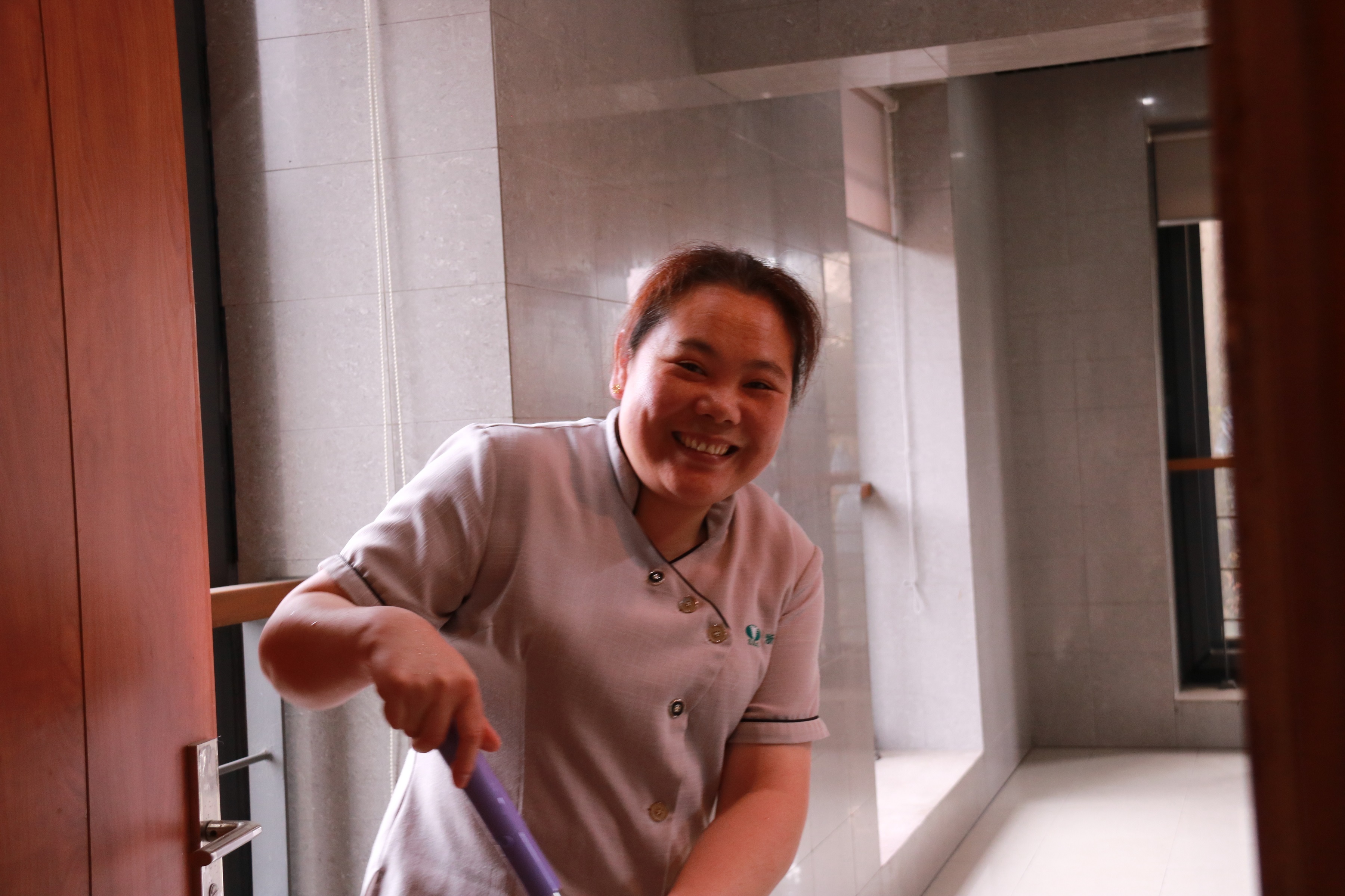 在教学楼认真工作的保洁阿姨。