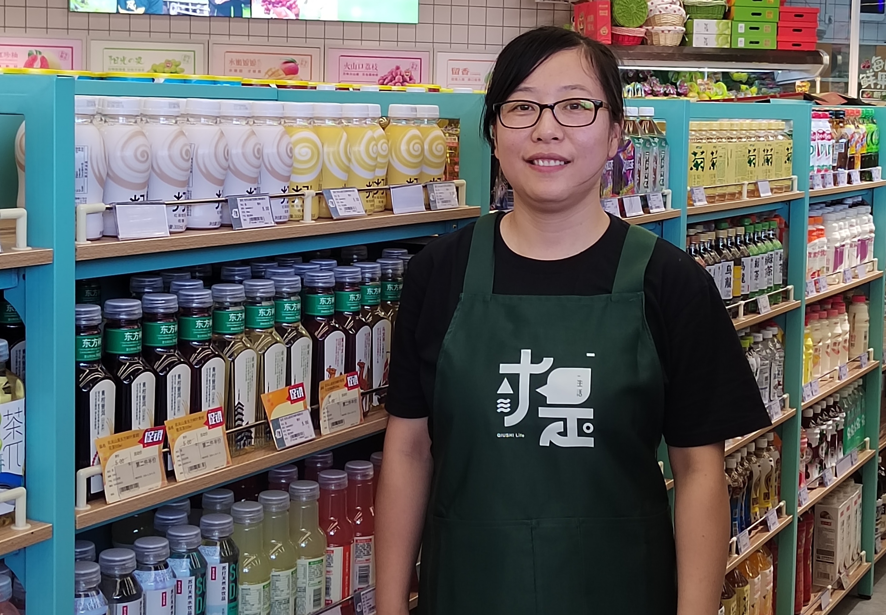 超市工作人员把货架上的商品摆得整整齐齐。