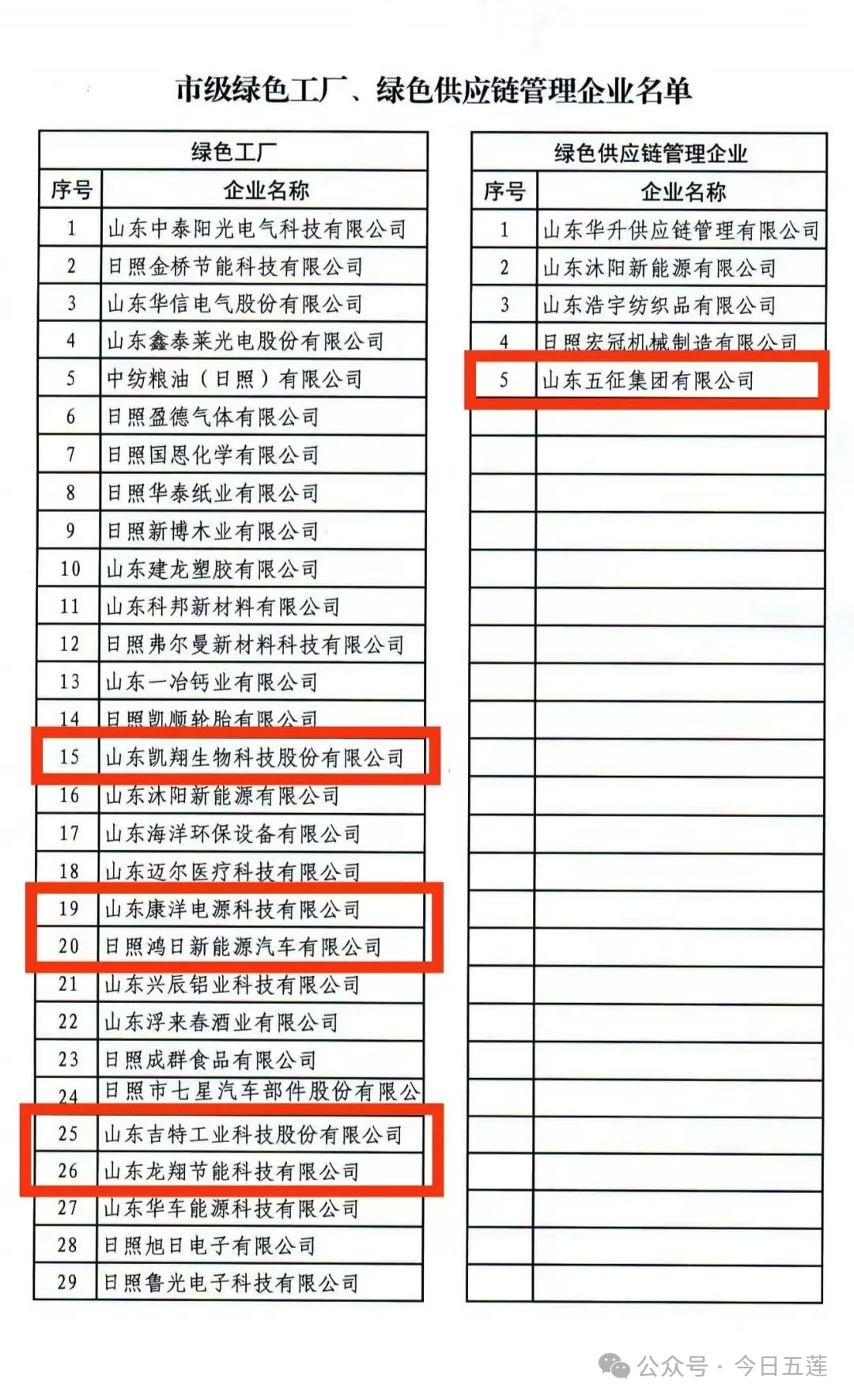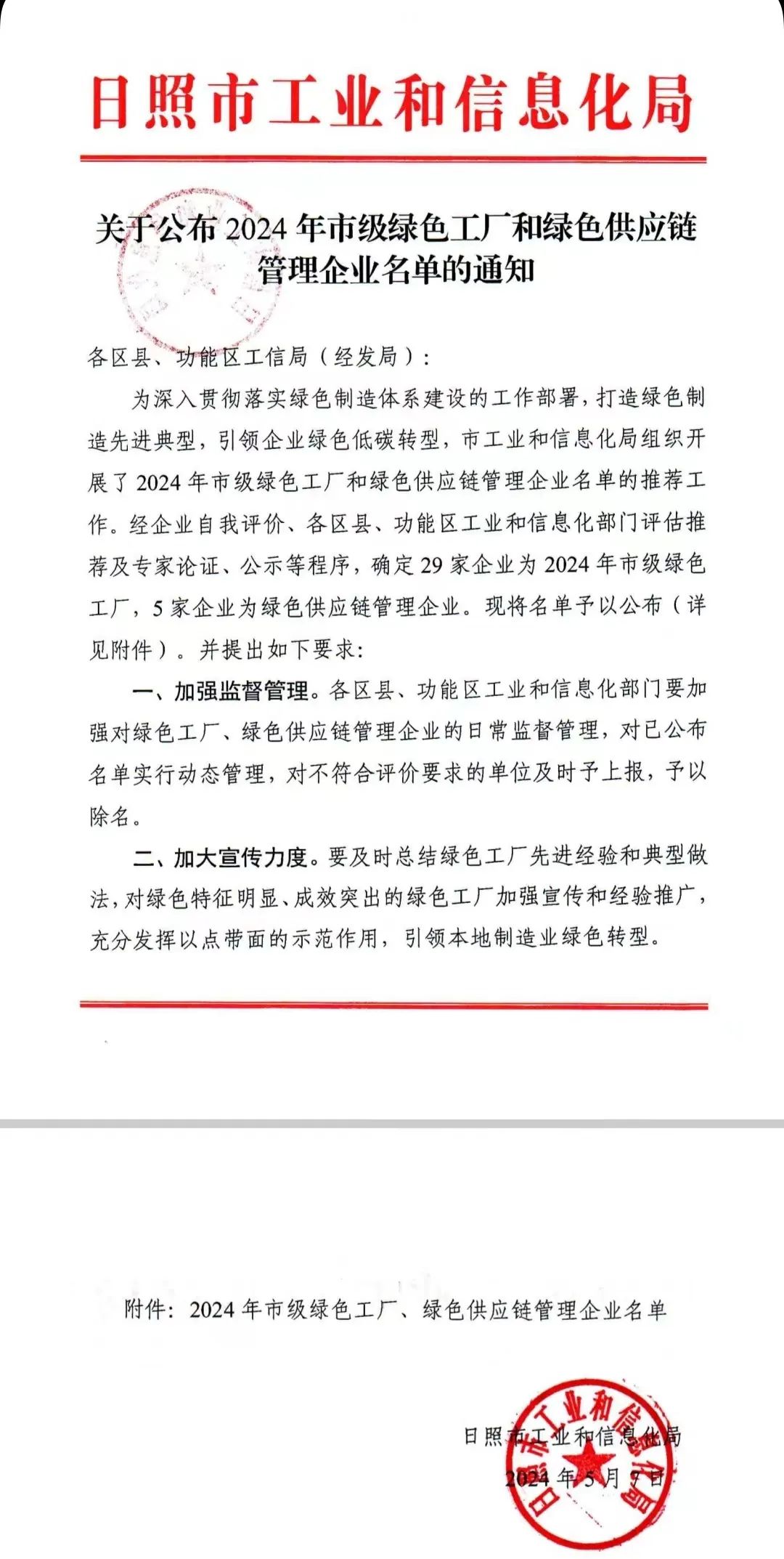 5月7日,日照市工信局公布了2024年市级绿色工厂和绿色供应链管理企业名单,五莲县推荐上报的6家企业全部入选。其中,山东凯翔生物科技股份有限公司、山东康洋电源科技有限公司、山东吉特工业科技股份有限公司、山东龙翔节能科技有限公司、日照鸿日新能源汽车有限公司5家企业入选2024年市级绿色工厂,山东五征集团有限公司入选2024年市级绿色供应链管理企业。