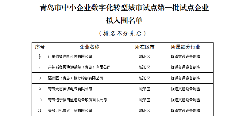 城阳融媒讯|近日,青岛市民营经济发展局青岛市中小企业数字化转型城市试点第一批试点企业入围名单,我区青岛悠进电装有限公司、青岛迈金智能科技股份有限公司、青岛泰泓轨道装备有限公司等61家企业成功上榜,入围数量占全市24%。