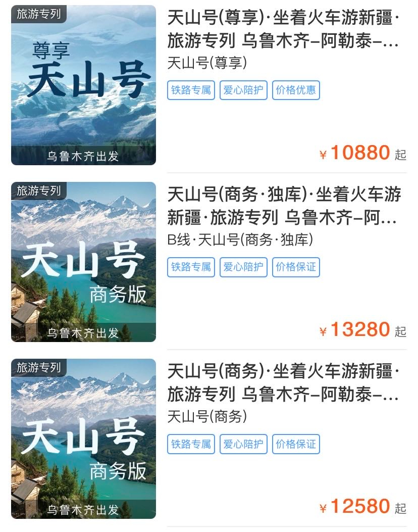 该旅游专列有3个种类可选:天山号(尊享)、天山号(商务·独库)、天山号(商务)。票价在10880元至19680元之间。