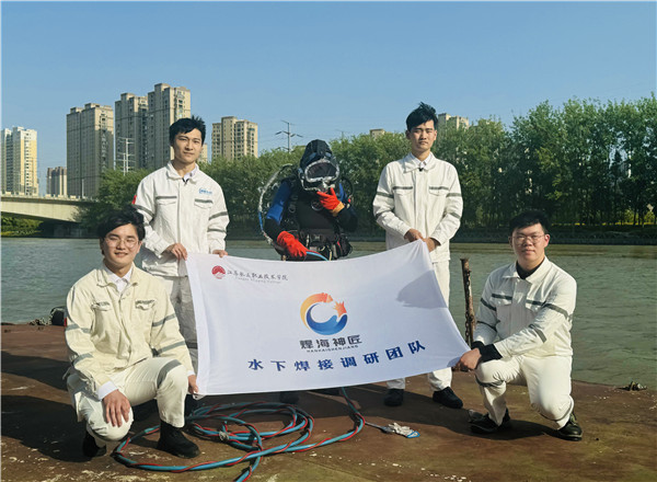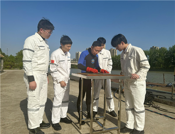 签约仪式结束后,调研组现场参观应急保障中心潜水设备仓库,中心潜水保障部为航院焊海神匠学生团队学生进行水下焊接演练,并就焊接情况进行技术交流。