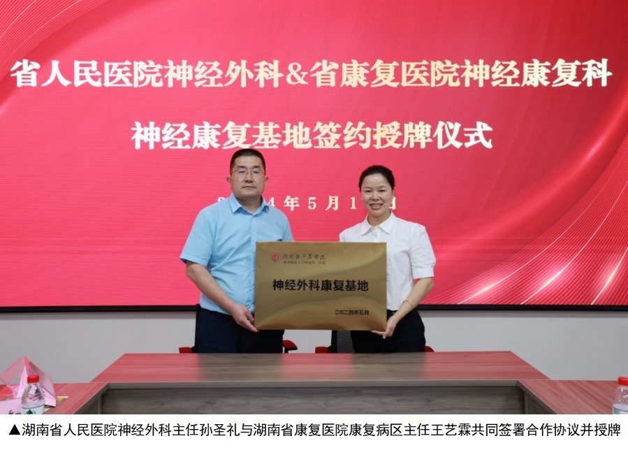 5月15日下午,湖南省人民医院与湖南省康复医院“神经外科康复基地”合作共建签约授牌仪式在湖南省康复医院举行。