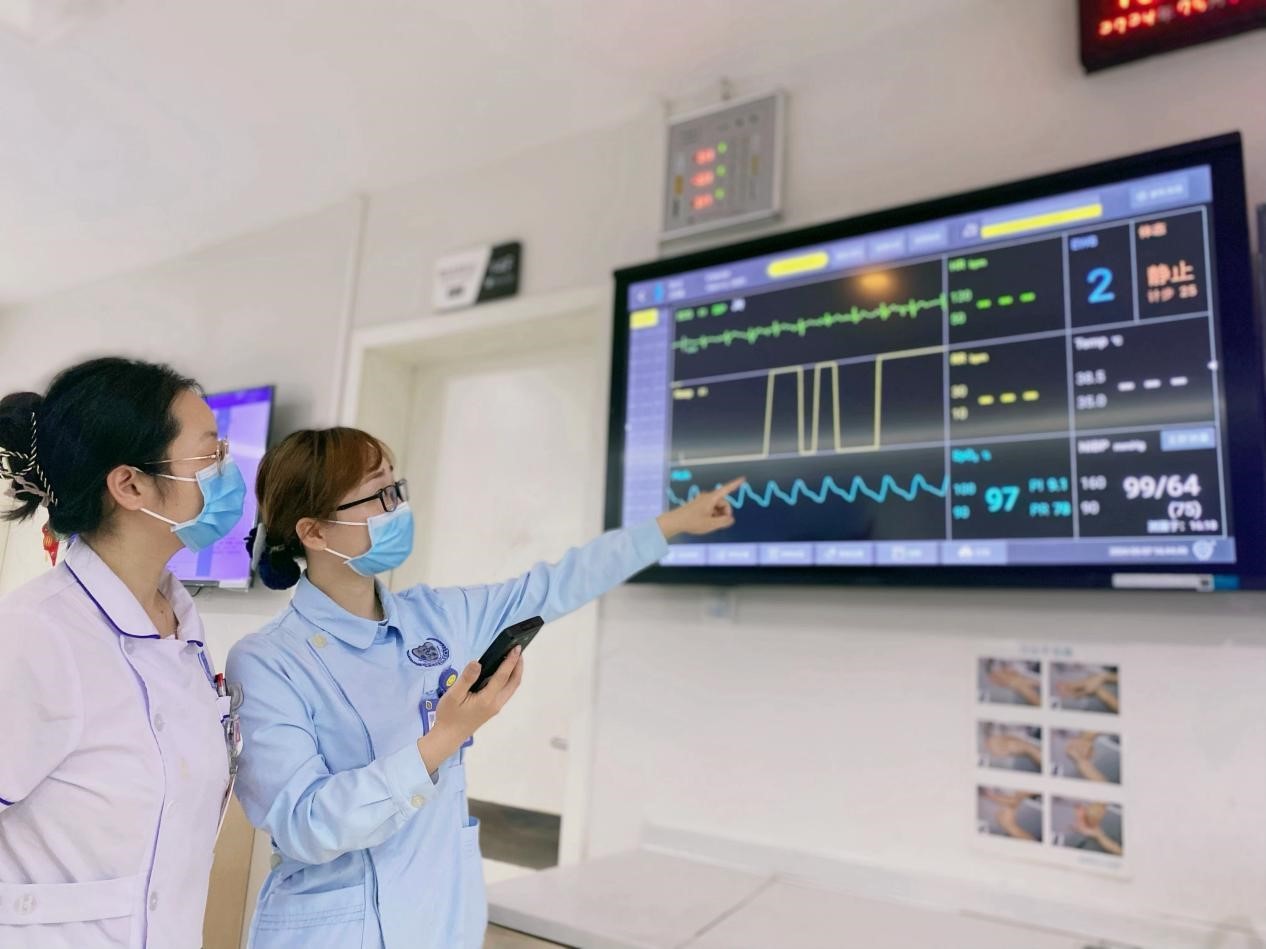 其次,病人享受的是智能生命体征监测。这是一种穿戴设备,置于患者心脏或手腕上,呼吸、心率、血压、血氧等生命体征信息可实时采集、传输。在护士站的中央监护屏上可一览患者的即时生命体征信息,一旦发现异常,可第一时间采取应急措施。“以前住院,身上各种线绑闷,动一哈都恼火,上个厕所都要重新接一次。”患者林爷爷说,如今的穿戴式监测设备让人感觉更加轻松。