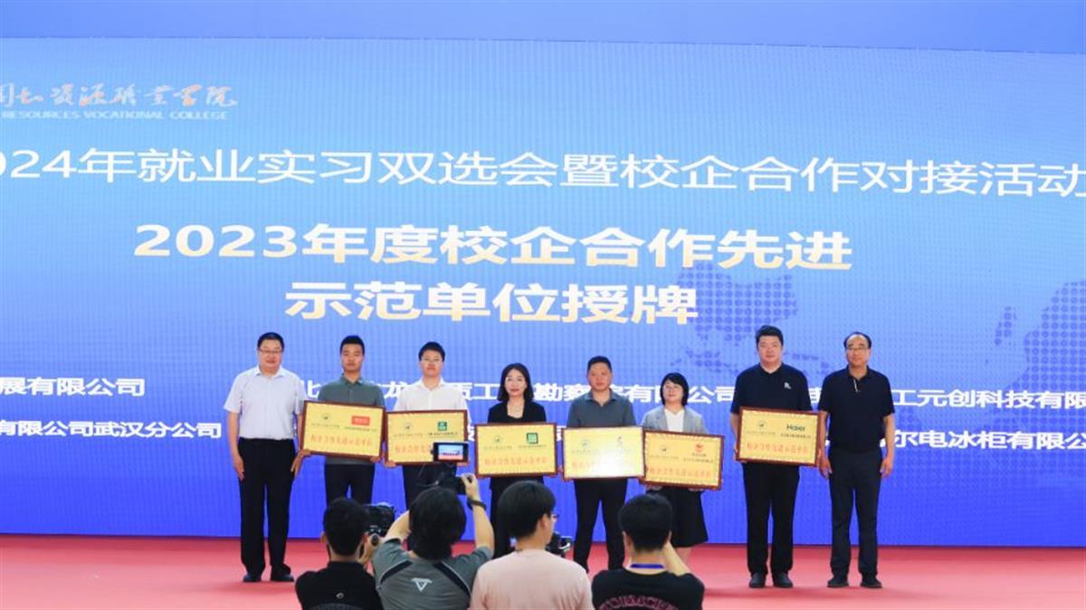 兴发集团矿产资源开发部副总经理张祖奎、武汉海尔集团(武汉海尔电冰柜有限公司)兰健副总经理、小鹏汽车华中(武汉)有限公司蔡武亮经理作为企业代表讲话。学校为武汉市优秀合作企业代表、经济开发区优质企业代表、武汉追月信息技术有限公司等8家校企合作先进示范单位授牌。