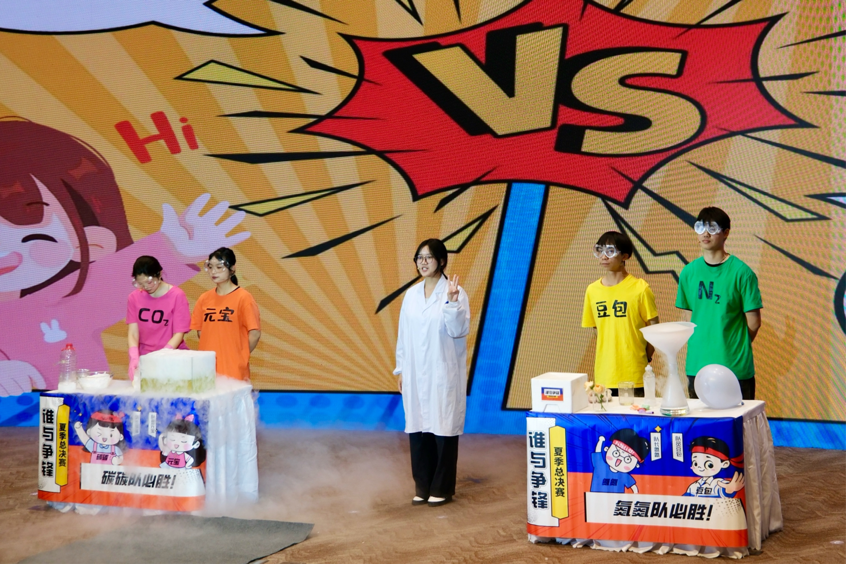 来自武汉文华学院的团队进行科学实验表演《谁与争锋》,他们以拟人的手段,用二氧化碳和氮气打擂台的形式,巧妙设计了多个趣味实验,用戏剧化的语言科普了两种气体的特性,以及在生活中的应用,用科学的魔法,为大家带来一场别开生面的视觉盛宴。