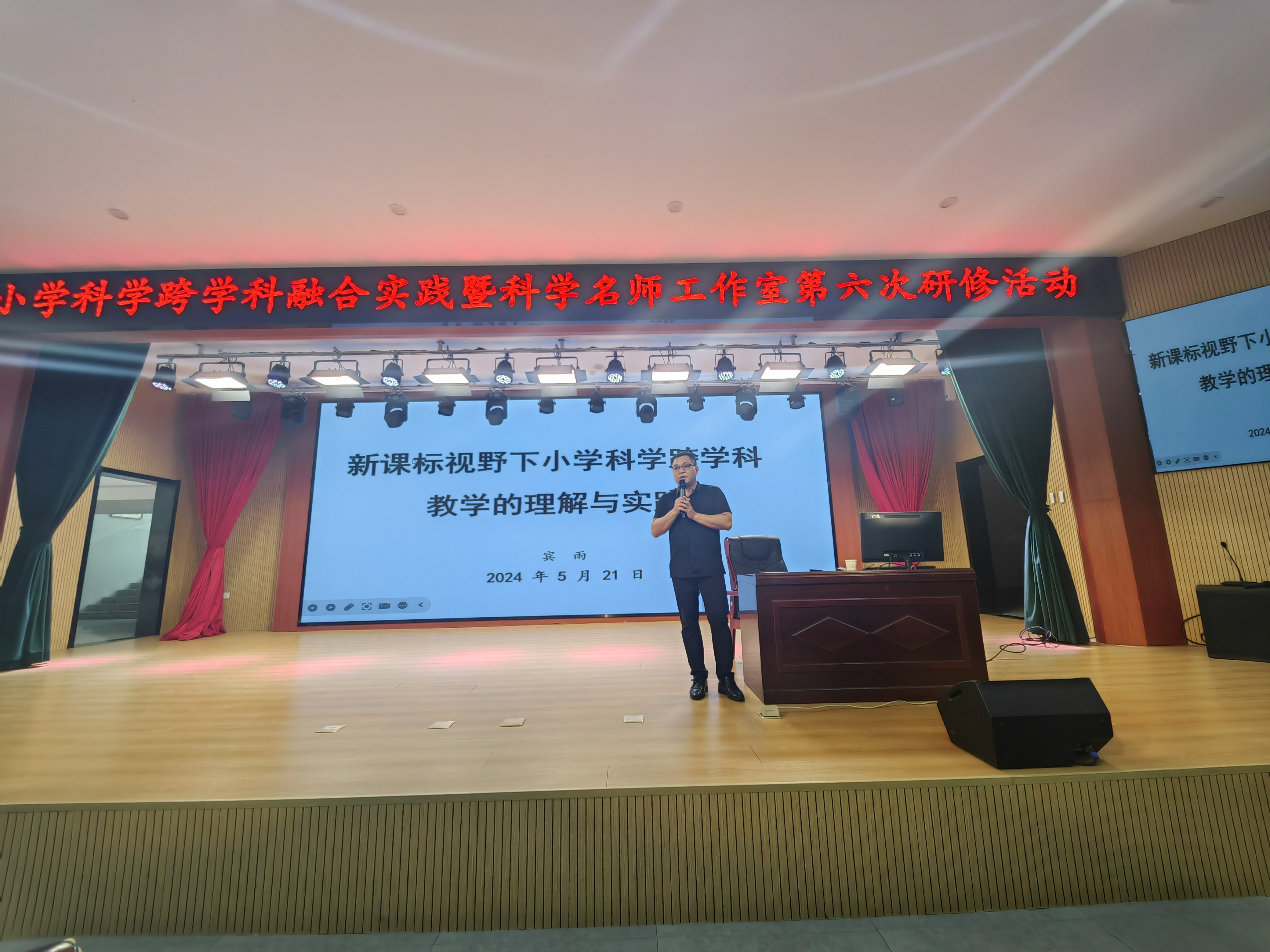 当天下午,工作室导师湖南省特级教师宾雨老师以《新课标视野下小学科学跨学科教学的理解与实践》为主题的专题讲座,他结合当下流行的“大单元教学、项目式学习、跨学科教学”等展开,让老师们不要偏离对科学学科的本真的把握,在教学中让学生形成像科学家一样思考、像工程师一样实践的科学思维。