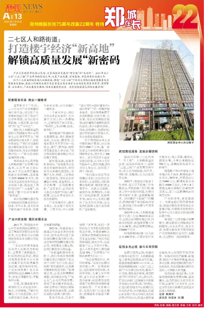 荆胡商业中心项目是人和路街道产业发展中的典型,从去年11月份以来,6个月完成项目整体招商从零到90%,盘活楼宇面积90000平方米,吸引各类总部经济和科技企业纷纷入驻,既创造了项目招引的“二七速度”,也创造了楼宇经济发展的“新奇迹”。