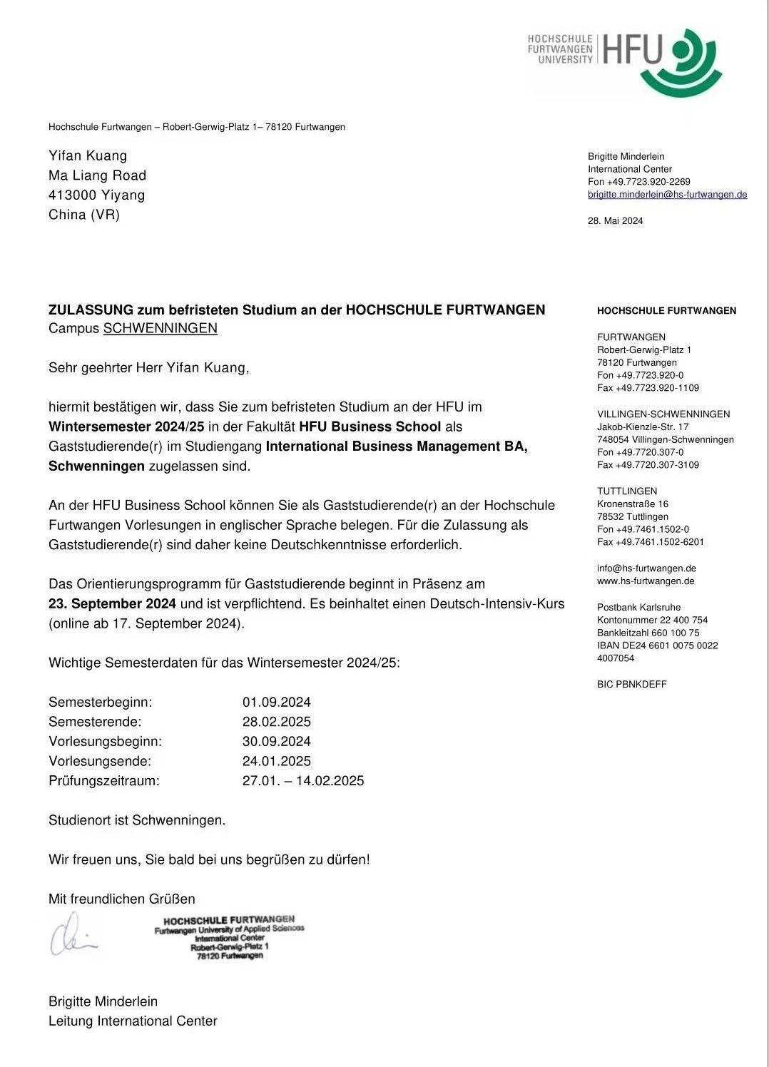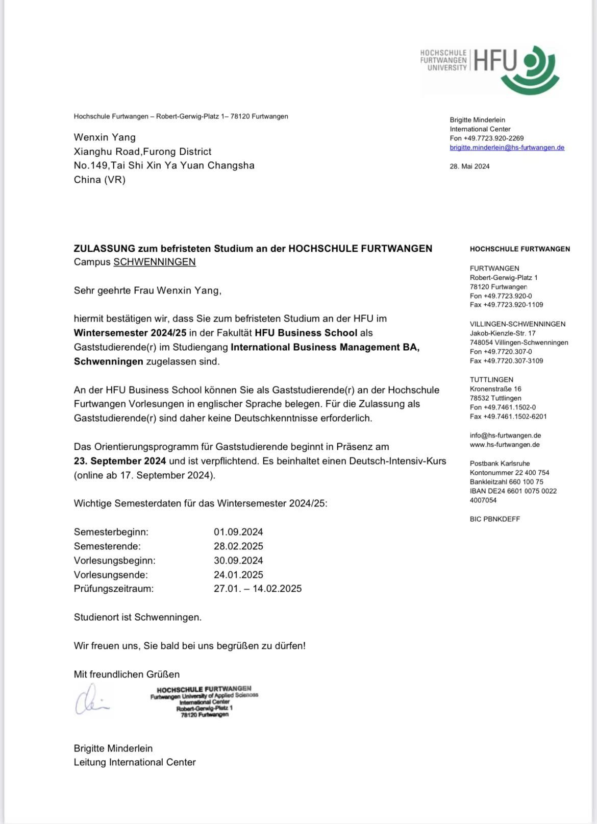 “亲爱的留学生,欢迎您来到施文宁根!我们相信这将是您一生中最美好的时光之一。”根据录取信息显示,他们被录取为HFU商学院的国际交换生,并将于2024/25冬季学期赴德开展国际商业管理BA学位课程学习。