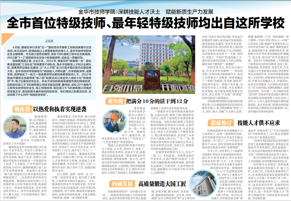 技能是强国之基、立业之本。2024年,我省召开“新春第一会”,提出要全面加强“三支队伍”即高素质干部队伍、高水平创新型人才和企业家队伍、高素养劳动者队伍建设,以“大人才观”全力打造中国式现代化建设者大军。金华市技师学院被誉为“高技能人才孵化器”,办学底蕴深厚,成果丰硕,培养输送了一批又一批高素养劳动者和高素质技师人才。2022年我省开展职业技能等级“新八级”制度试点以来金华入选的4位“特级技师”中,有2位是该校毕业生。毕业于该校的姚海涛是我市首位特级技师,目前担任浙江今飞机械有限公司技术副总经理;董伟俊,该校2011届电气工程专业技师班毕业生,电工特级技师,现任浙江今飞机械有限公司电控研发室主任,是目前我市最年轻的特级技师。他们用自己的真实经历,生动诠释了什么叫作“技能改变命运”。