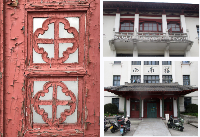 西南宿舍楼作为同济校园里唯一采用大屋顶的建筑,在细部设计上,借鉴了北方官式大屋顶的形制,并在檐口、屋脊、漏窗、花栅和入口等处,运用了删繁就简、部分采用具有地方特色的传统处理手法。