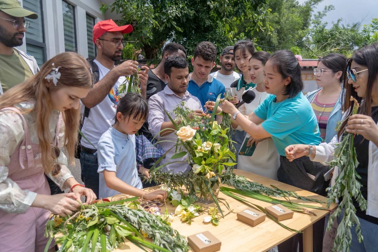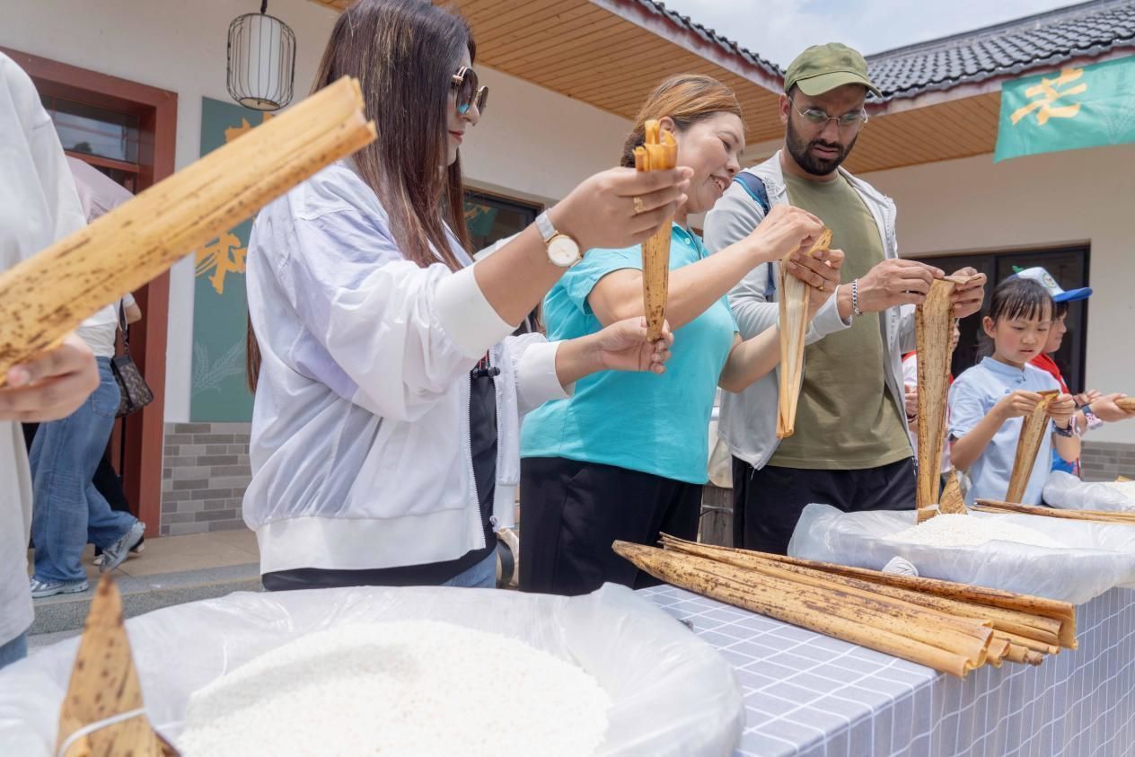 “这米好白!” 学习了插花,中外留学生们又来到了“和美小院”,一跨进院子,大家便看到已经准备好的包粽子材料:糯米和粽叶。“如何包,能教教我吗?”中外青少年们随即向村民们请教。