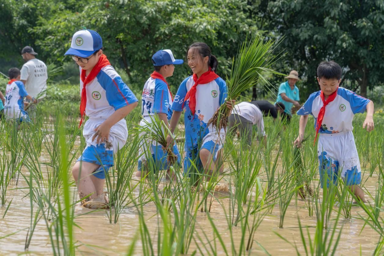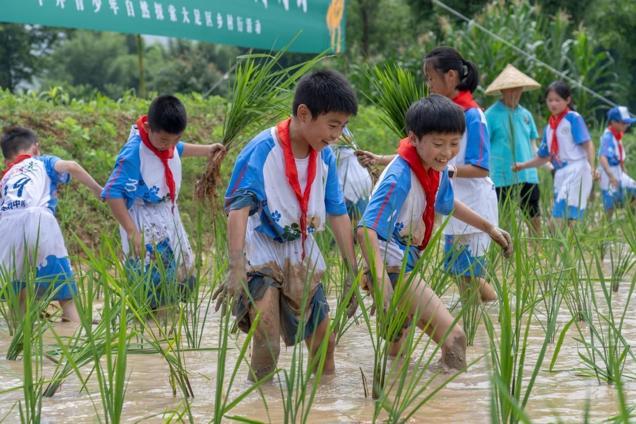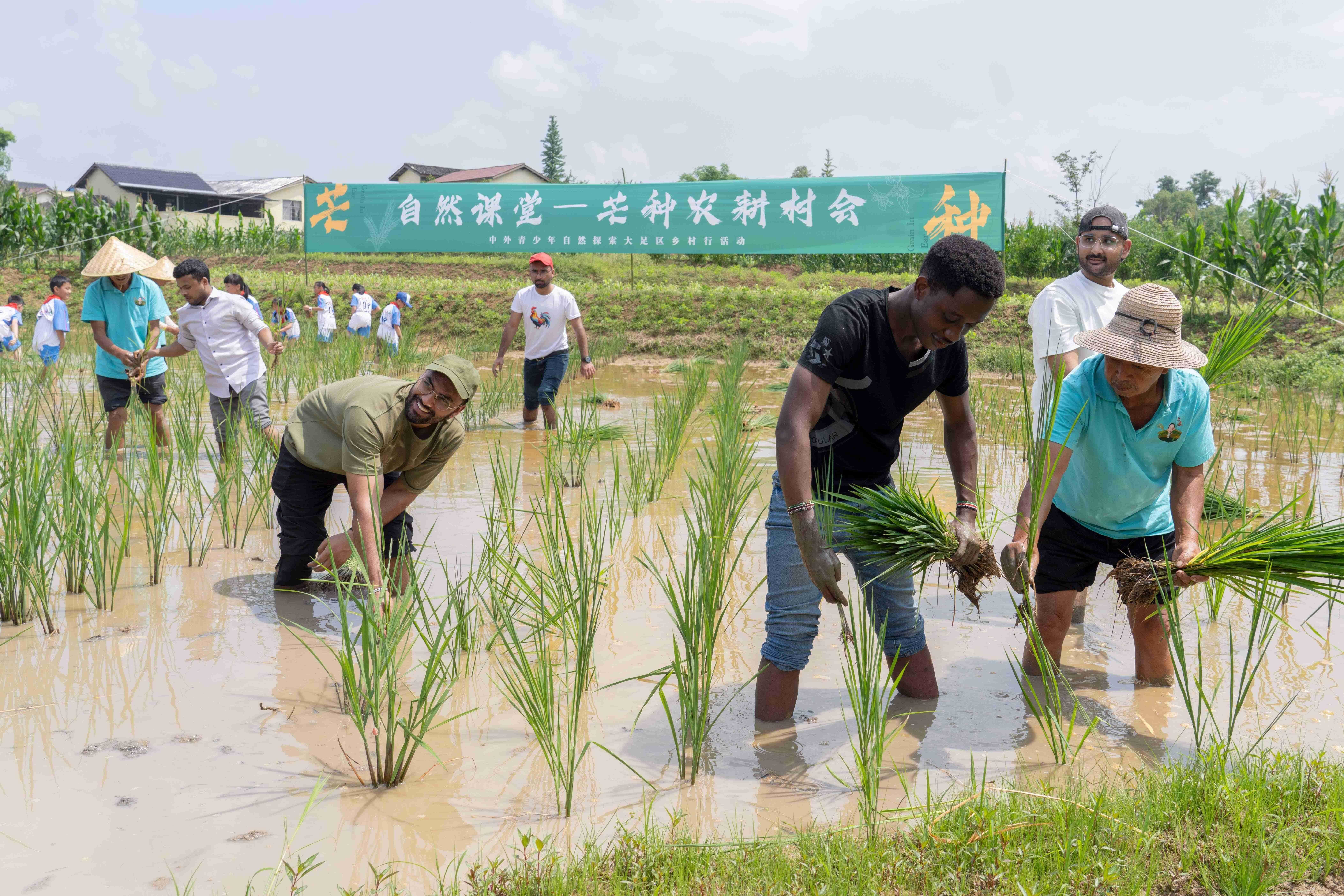 “插秧的时候,切忌五指一起拿着秧苗,插入泥田里,这样栽种下去坑会比较大,秧苗也会栽不稳……”中外青少年纷纷褪去鞋袜,走向田间,参与插秧体验。记者在现场看到,虽然中外青少年们插秧的技术不是那么娴熟,在村民指点下,大家逐一将秧苗稳稳地插在了田间。