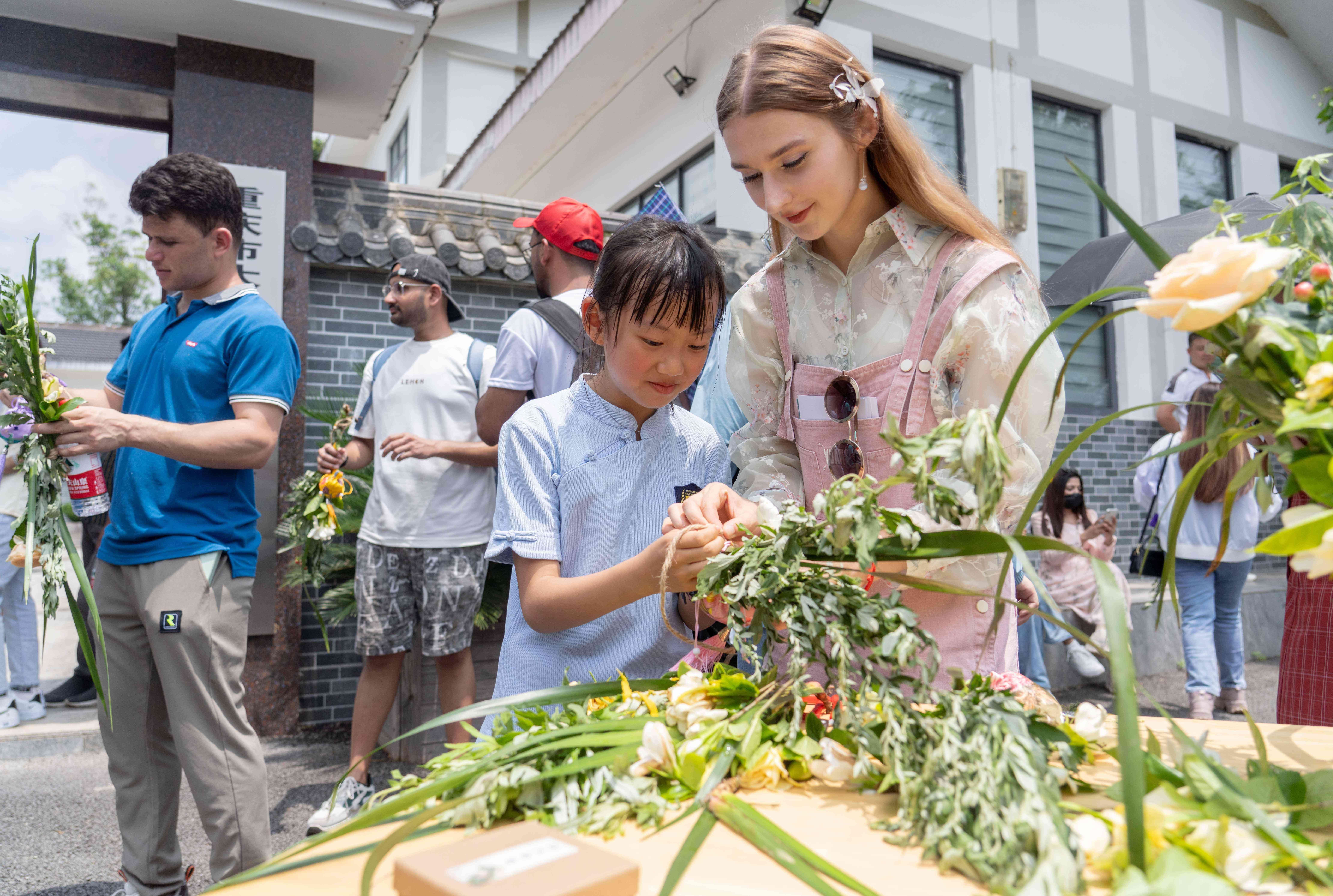 随后,中外青少年在插花老师的指点下,做出了自己喜欢的艾草菖蒲花束,还祝福大家:“端午安康!”