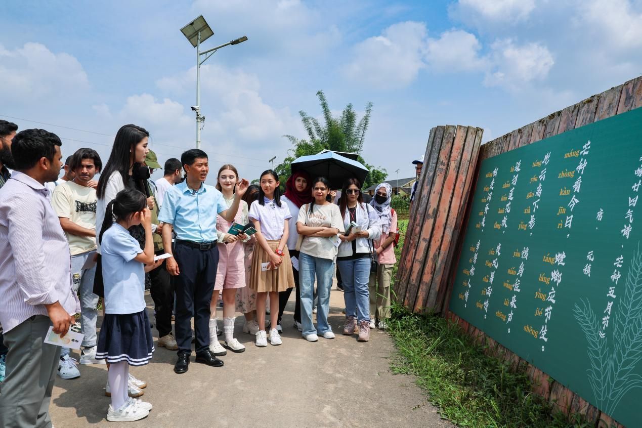 “芒种看今日,螳螂应节生。彤云高下影,鴳鸟往来声……”班会结束后,中外青少年们行走在田间地头,一首唐代元稹的《咏廿四气诗·芒种五月节》吸引了大家的注意。